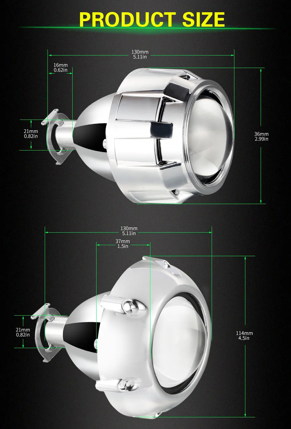 Размеры линз проектора: 2,5 дюйма Материал линз: Стекло Проектор Материал: металл Материал крышки: Пластик Подходит для 9005 HB3/9006 HB4/H4/H7 фар Тип лампы проектора: H1 (ксенон/светодиод/галоген)