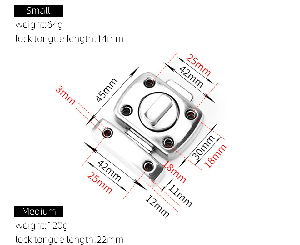 100% новый и высокое качество. 1. Изысканный и модный дизайн, отлично работает с обеих сторон цели. 2. Компактный, прочный и полезный замок для различных целей, таких как двери, окна и т. д. 3. Изготовлен из цинкового сплава, обеспечивает прочное использование и долгий срок службы во влажной среде. 4. Простая установка. Установка фиксации винтов (посылка включает 1 замок и 6 винтов).