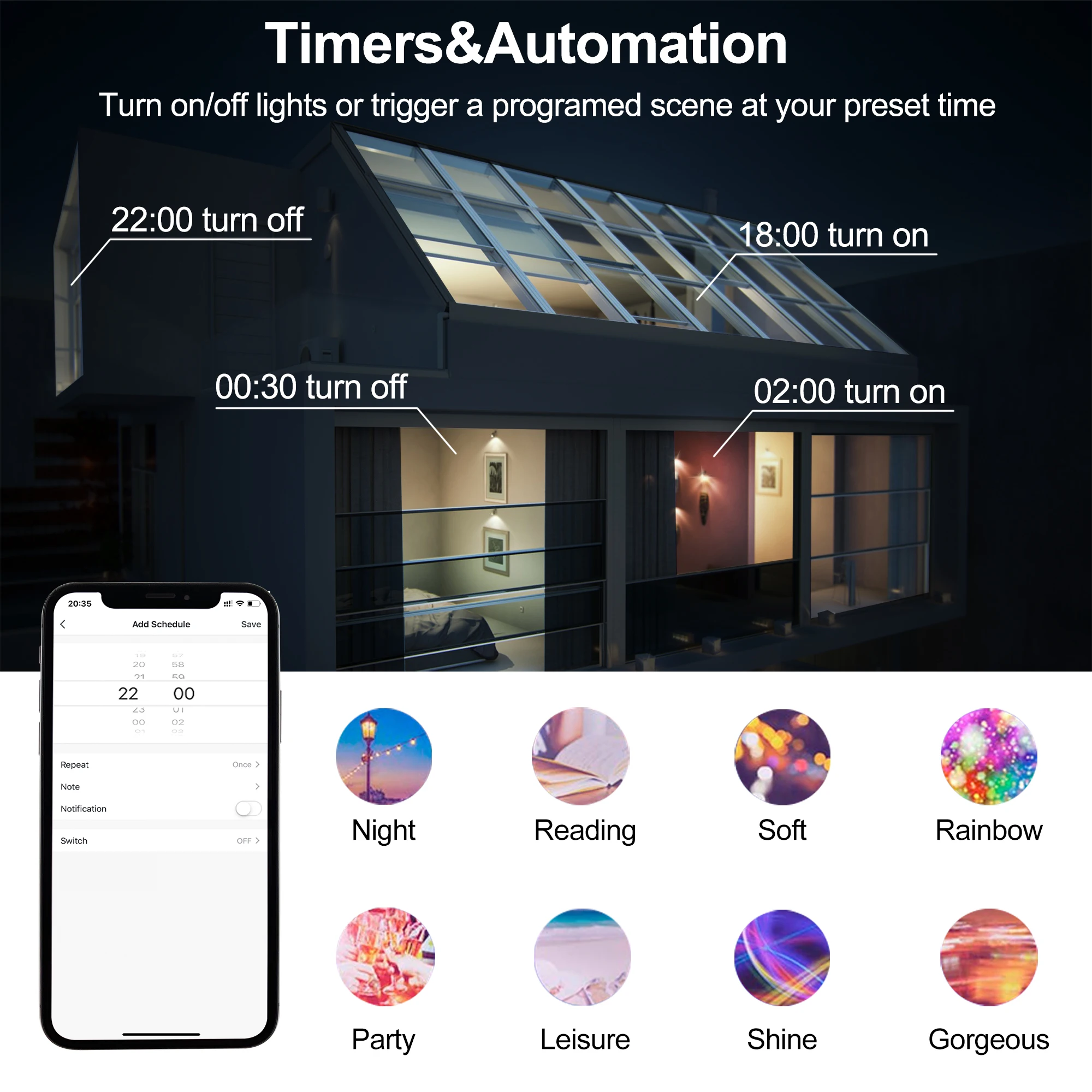 Вы можете редактировать восемь заданных сцен в соответствии с Вашими пожеланиями, четыре сцены разработаны как вечерние, чтение, сон, режим отдыха и другие четыре сцены, или создать пользовательскую сцену, и пусть ваше творчество будет бесплатным. Вы также можете настроить несколько графиков, чтобы включить и выключить свет в соответствии с предварительно установленным временем, которое вы хотите. Расписание можно повторять ежедневно или еженедельно.