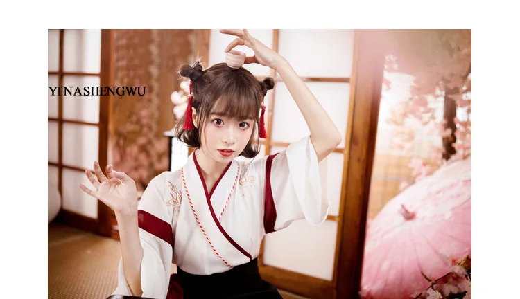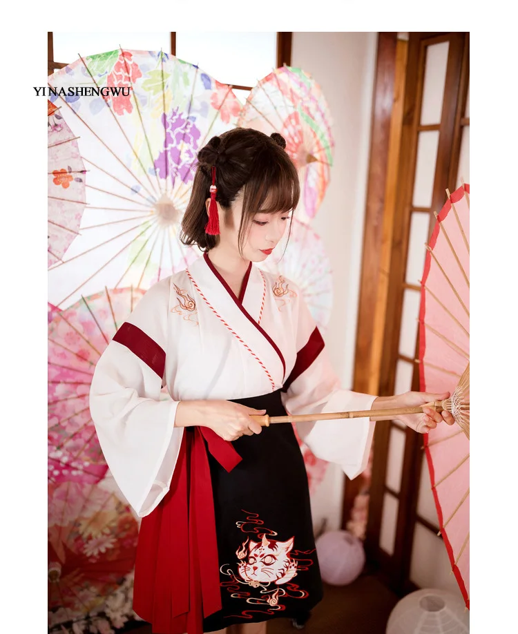 Японское платье-кимоно, женское черно-белое платье с вышивкой кошки, винтажная азиатская одежда, юката, хаори, костюмы для косплея для вечеринки, комплекты из 2 предметов