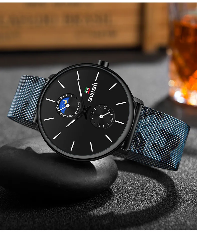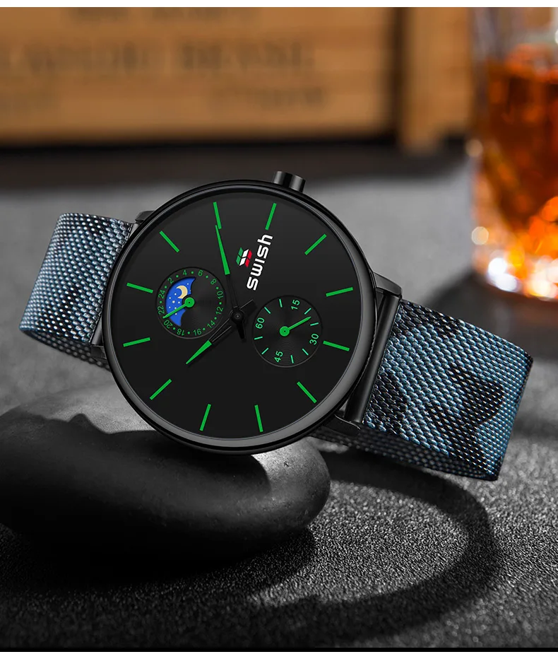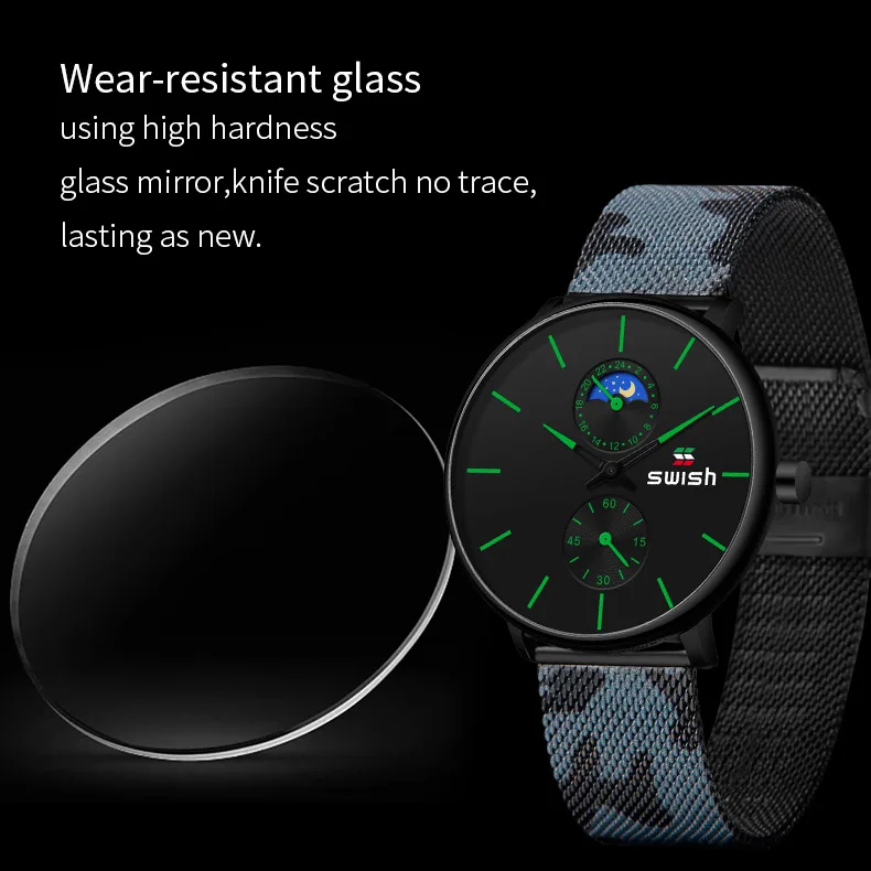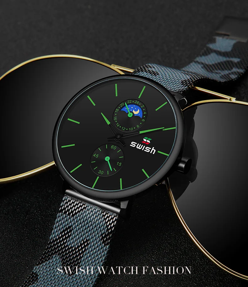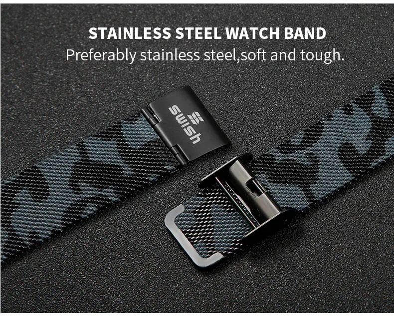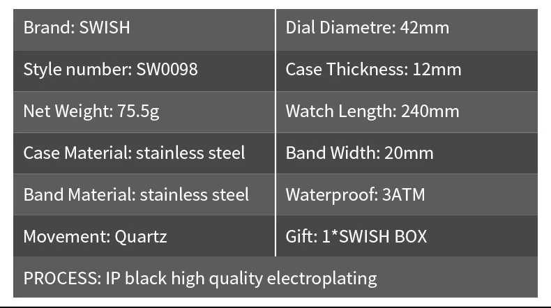 Бренд: SWISH Основная особенность * 100% новые и высококачественные ** 3 АТМ/30 М Водонепроницаемость (поддержка холодного душа и плавания, не используйте часы под водой, не поддерживайте горячую воду); *** Качественный чехол из нержавеющей стали; **** Качественная нержавеющая сталь 1 * набор = 1 * SWISH Watch