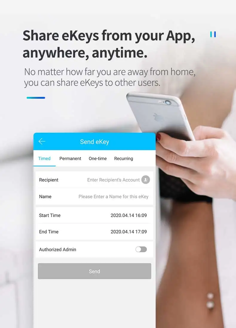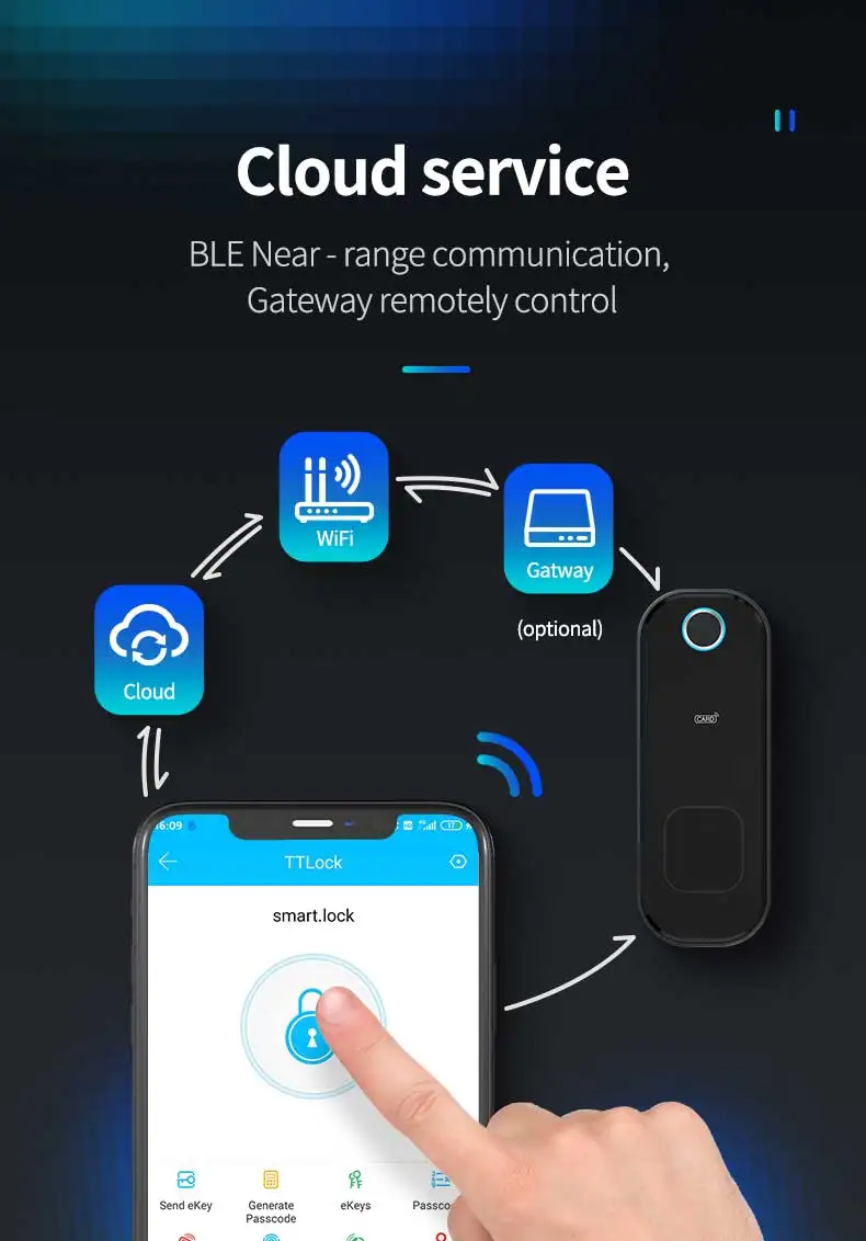 Вы можете разблокировать дверь через приложение TTLock удаленно (в пределах 10 метров). Если вы хотите подключить замок к WiFi, вы можете использовать шлюз, затем вы можете управлять блокировкой удаленно, даже если вы находитесь в другой стране.