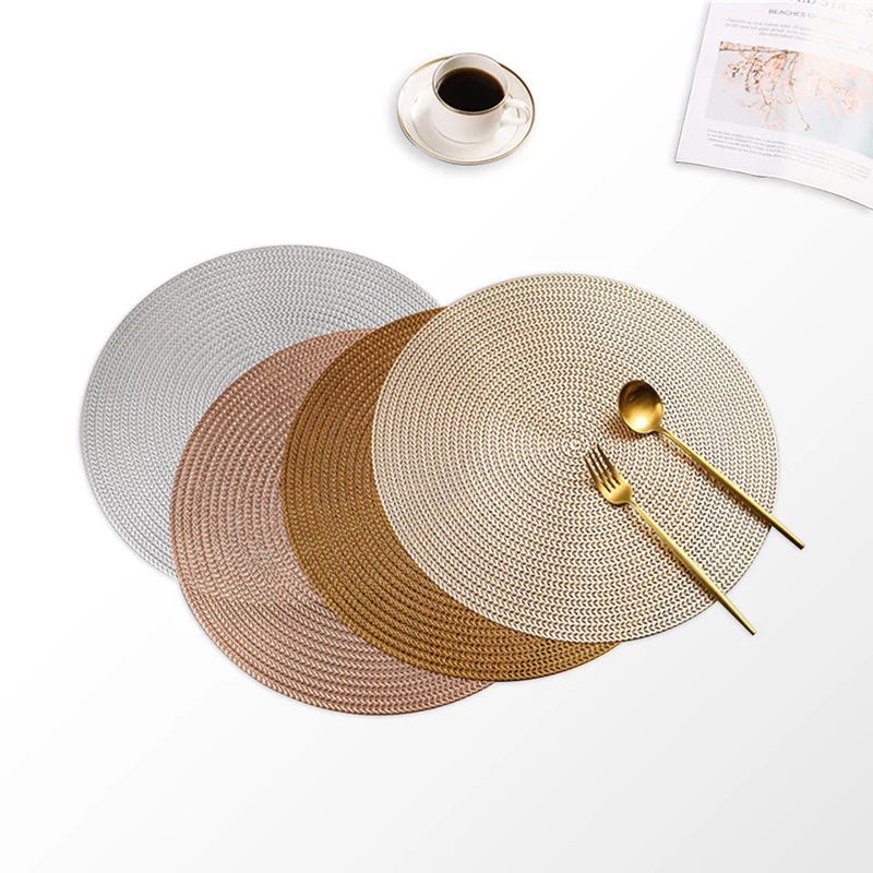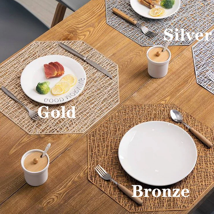 Материалы: мягкий ПВХ форма: восьмиугольный/круглый цвет: золотой, серебряный, коричневый, розовое золото Применимая сцена: кухня; Вечерние; Праздничный Вес: около 120 г Размер: как показано на рисунке особенность: водонепроницаемый, нескользящий, украшение для дома