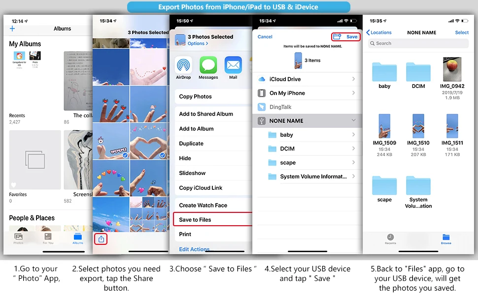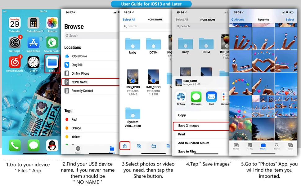 1. Под iOS 9,2-12 поддерживается только Передача фотографий и видео. Поддержка стандартных форматов фотографий, таких как JPEG и RAW и т. д. файлы изображений должны быть сохранены в именованной папке DCIM. Цифровая камера может автоматически создавать папку DCIM. Но если USB флэш-диск. Необходимо создать папку DCIM и скопировать ее вручную.