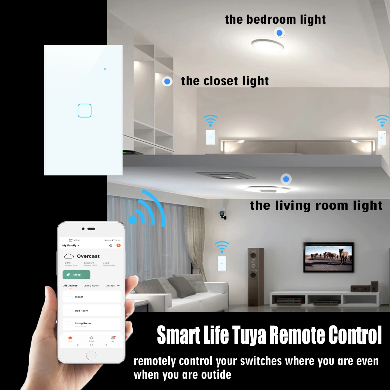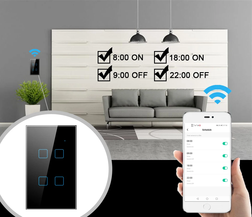 D. Настроить свой собственный Scence: один ключ контролирует мульти переключатели. Например, установите свой дом, чтобы автоматически выключить выключатели, когда вы выходите из дома. Экономьте время.