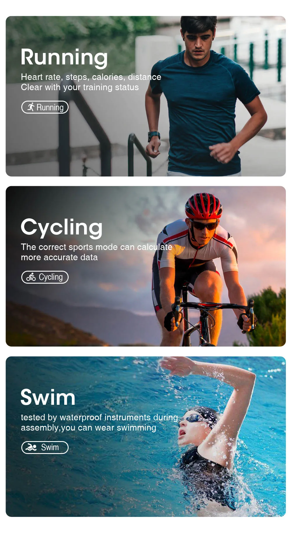 Отслеживание движения: Расстояние/калории/шаги/мультиспортивный режим Отслеживание здоровья: 24-часовой непрерывный сердечный ритм количественное определение мониторинга/крови контроля давления/мониторинг кислорода в крови/Sleep (Пробуждение/спящий режим) мониторинга Уведомления о сообщениях: звонки, SMS, Wechat, QQ, Facebook, Twitter, LinkedIn, WhatsApp, Line, Instagram, Snapchat, Skype, Gmail Другие функции: Управление камерой Bluetooth/Яркость/Будильник/напоминание о сидячем положении/Поиск телефона/Поиск часов
