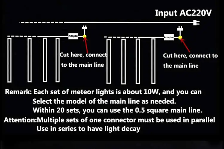 Светодиодный светильник для трубки: 20 см-24 светодиодный s; 30 см-48 Светодиодный s; 50 см-72 светодиодный s Количество труб: 10 трубок в комплекте Светодиодный свет пробки длина: 30 см/50 см/80 см Диаметр трубки: Тип вилки: штепсельная вилка европейского стандарта/штепсельная вилка американского стандарта Общая длина: около 350 см Рабочее напряжение: 85-265 В переменного тока Особенности: 1. Эффект метеоритного дождя, романтическая эстетика 2. Светильник каждой лампы включается и выключается один за другим последовательно и быстро, как метеоритный дождь или падающий снег в ночном небе 3. Применение: рыночное инженерное освещение, архитектурное украшение, украшение деревьев вдоль улиц, парки, украшения, декоративные реки, городское ночное освещение 5. Водонепроницаемый, пыленепроницаемый, устойчивый к коррозии 6. Низкое энергопотребление, энергосбережение Посылка Содержание: 20x10 шт. светодиодный Метеоритный дождь трубчатая лампа + 20 шт. адаптер питания