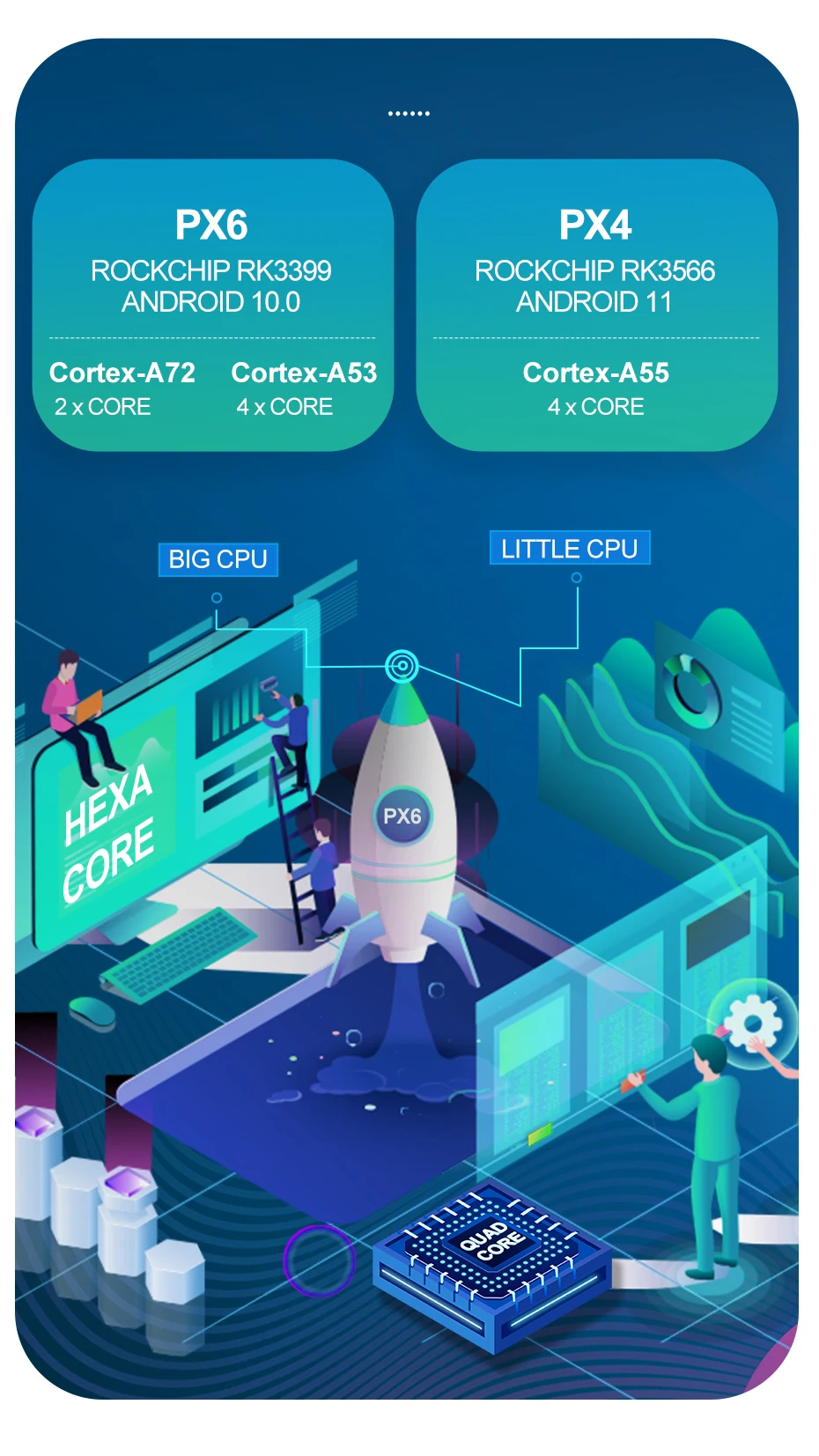 PX6: Rockchip RK3399, шестиядерный, Cortex-A72 * 2 + Cortex-A53 * 4