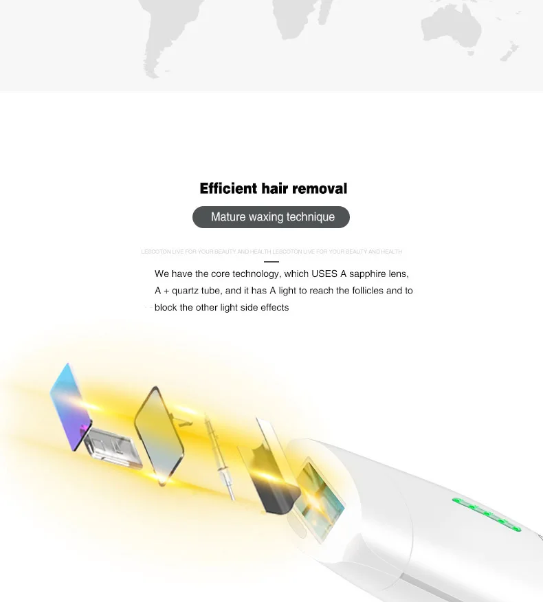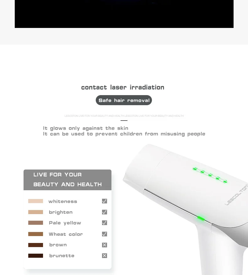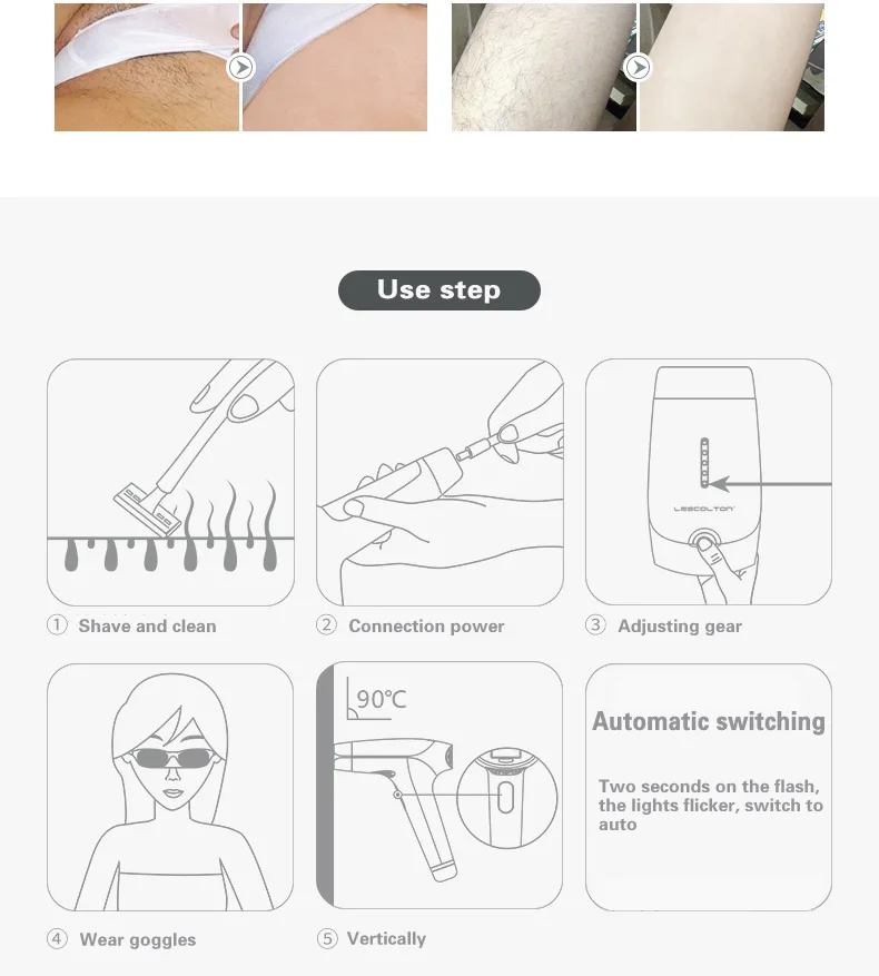 Lescolton IPL лазерная машина для удаления волос лазерный эпилятор для удаления волос постоянный бикини 5 уровней домашний электрический эпилятор a лазер. По сравнению с другими популярными моделями, в этой модели используется высокоуровневая кварцевая лампа для удаления волос, чтобы иметь гораздо больше времени вспышки 1. Применимо: Рабочее напряжение 100 ~ 240 В, подходит для всех стран мира. 2. Постоянный: IPL работает внутри пор, разрушает волосы papilla, таким образом, обеспечивает постоянное удаление волос. 3. Длительный срок службы: кварцевая лампа для удаления волос с более длительным сроком службы и долговечным использованием. 4. Нулевые расходные материалы, без средних, без расходных материалов. 5. Безболезненный: пять регулируемых оптимальных уровней энергии в зависимости от толерантности кожи. Обеспечивает нежное лечение безболезненно и легко, не повреждая кожу. Светодиодный светильник ясно показывает уровень энергии. 6. Быстрая и Большая область обработки: 4,2 квадратный см размер места не слишком большой или не слишком маленький для любой кривой тела, высокая эффективность и быстрая скорость, которая занимает всего несколько минут, чтобы удалить перекрещивающиеся волосы, которые трудно для традиционного метода удаления волос. 7. Безопасность: не влияет на нормальное выделение пота и кожного сала. 8. Удобно: портативный dsign и легко брать. 9. Способность обнаружения кожи: яркий зеленый светодиодный свет, когда устройство готово к работе.