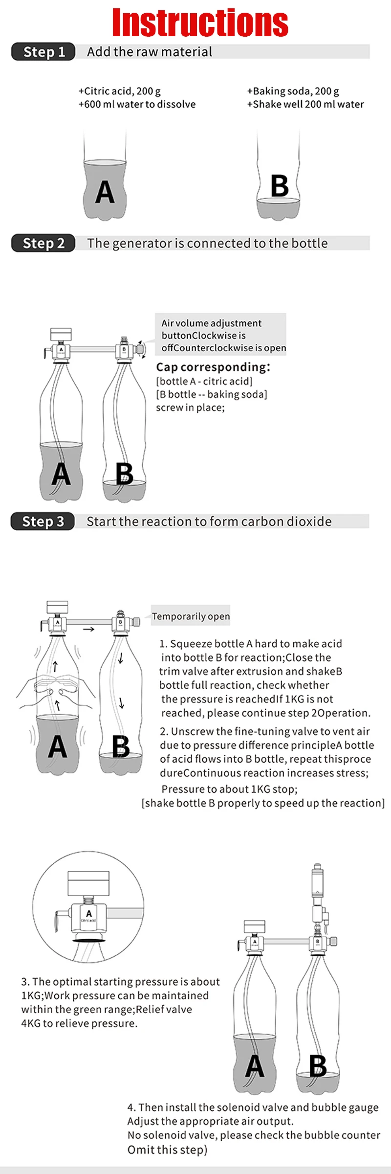 Особенности: Полностью установлен, предназначен для использования и экономии труда. Хорошо Запечатанные крышки и трубы, герметичные, не деформированные, никогда не теряют форму. Профессиональное давление для безопасной области индикации, наблюдения за давлением. Декомпрессия автоматически для более безопасного использования и эксплуатации. Дешево, просто создавать чистый CO2 постоянно химическими реакциями. С регулируемым воздушным потоком vavle для легкого контроля объема CO2. Источник питания: Вход AC100-240V выход DC12V Функция: подходит для AC110V-AC220V питания Доступны в странах/регионах с мощностью 110 В или 220 В Примечание: 1. Не открывайте бутылку напрямую, когда все еще находится на давлении, пожалуйста, подождите его автоматического сброса давления. 2. Пожалуйста, используйте лимонную кислоту и пищевую соду в качестве сырья. 3. Для получения более конкретных инструкций и использования, пожалуйста, прочитайте руководство пользователя на английском языке. 4. Начальный набор предохранительных vavle 4 кг/с, вы также можете настроить его вручную. Основные условия эксплуатации 1: Сначала установите соотношение, затем откройте регулирующий клапан и обнаружите, что пищевая Сода-это пузырьки и закройте, встряхните бутылку для полного ответа (не встряхните вверх и вниз) 2: не показывая 1 кг, используйте распределительный клапан, чтобы снова открыть пузырек пищевой соды, закройте клапан переодевания снова, а затем встряхните бутылку (не встряхните его вверх и вниз) 3: Следуйте методу видео (если манометр не достигает 1 кг, пожалуйста, повторите операцию 1-2 раза терпеливо, пока давление не повысится)