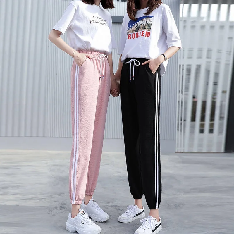 Женские шаровары, большие размеры, розовые, черные, для бега, летние, Harajuku, повседневные, с боковыми линиями, спортивные, женские, для фитнеса, брюки