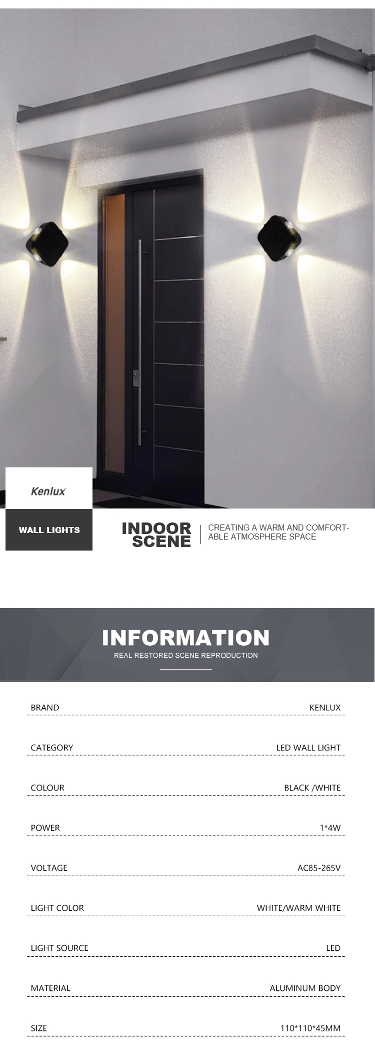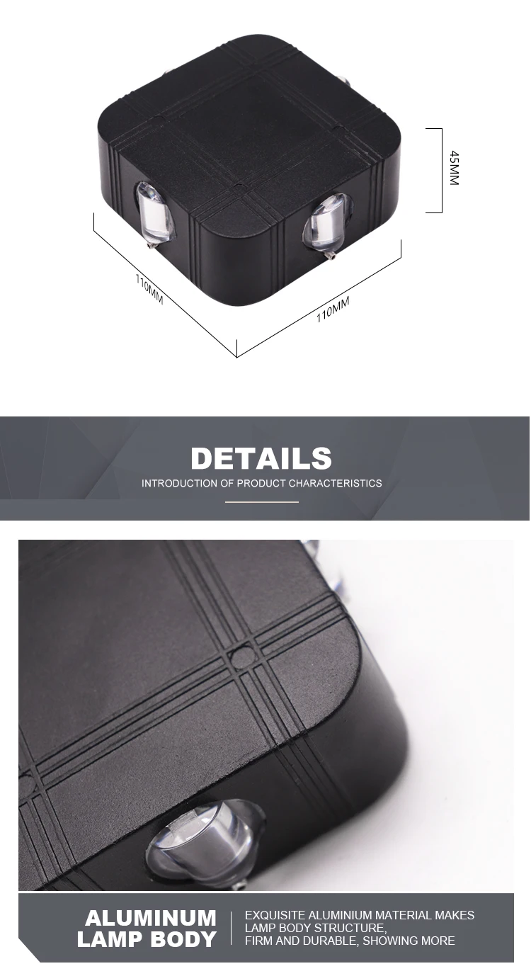 1. Мощность: 4*1 Вт 2. Чип: чип COB 3. Цвет излучения: теплый белый 4. Цвет корпуса: черный 5. Вход напряжение: 85-265 В переменного тока, 50/60 Гц 6. Материал корпуса: алюминий 7. Размеры: 110*110*45 мм 8. IP 65 водонепроницаемый 9. Люмен: светодиодный чип 100-120лм/Вт