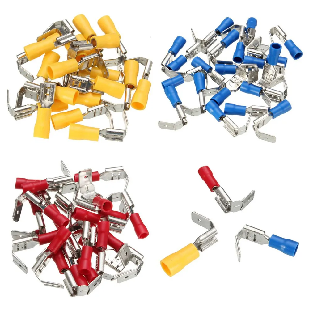 Тип: изолированный обжимной станок Форма: лопата Размеры: 6,3 мм Цвет: красный, синий, желтый Посылка: 50 шт. Руководство по цвету изоляции: Красный-максимальный размер провода 0,5-1.5mm (16-22AWG) Синий-максимальный размер провода 1,5-2.5mm (14-16AWG) Желтый-размер провода 4-6 мм, 2-12AWG Ассортимент разъемов piggyback с ПВХ изоляцией, подходящими для широкого спектра применения, включая коммерческую, автомобильную и бытовую. 6,3 мм Размер Доступные цвета: красный, синий, желтый, ПВХ Латунные контакты с Оловянным покрытием