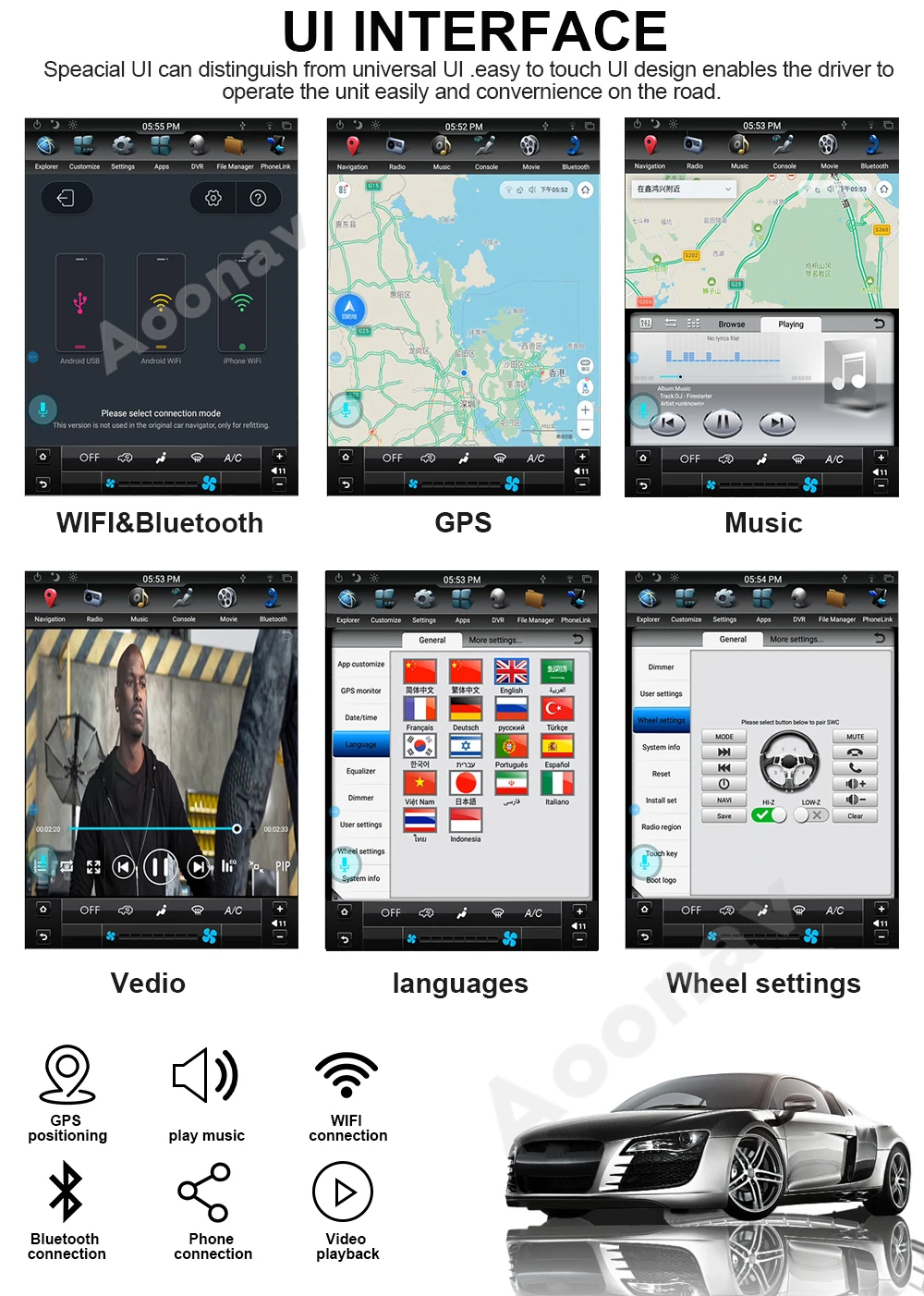 1.USB port: USB2.0host / USB OTG 2.Built-in wifi (RTL-8189ETV--CG) (use the hotspot on your smartphone to connect to the internet) 3.Built-in Bluetooth, Bluetooth 5.0 phone freehand call synchronization contact list 4.Supports Apple Phone (CARPlay), Android Phone (Android Auto) mobile phone interconnection function 5.Built-in Google Play Store app, download the apps you need 6.Support original car functions (such as air conditioning, atmosphere lights, steering wheel function, original car reversing image, etc.)