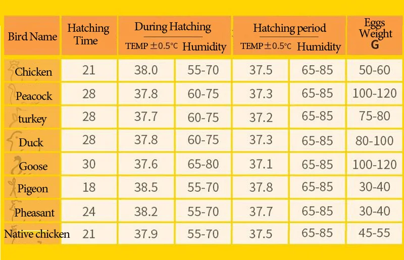 -Сигнализация температуры/сигнализация влажности (при выходе из горного диапазона) -Автоматическое программирование базовой температуры производителя. -Светодиодный дисплей температуры/гумидит/инкубационные дни/время поворота яйца -Автоматический инкубатор для яиц не требуется. -Простота в эксплуатации, даже ваш ребенок может научиться использовать его. -Легко чистить, просто использовать с инструкциями. -Подходит для инкубации всей птицы: кур, уток, гусиных животных, индейки и т. Д.