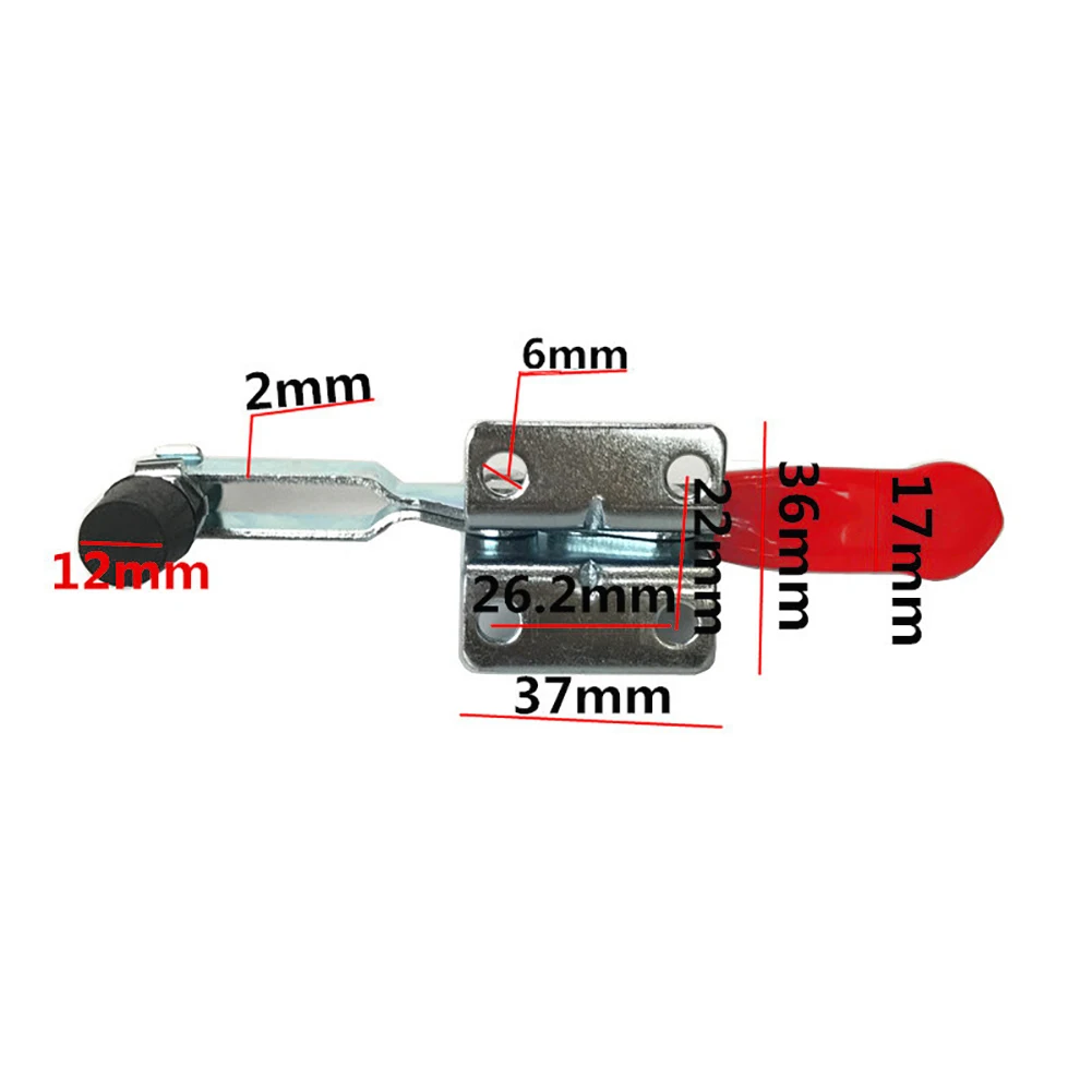 Особенности: Тип: горизонтальный Угол открытия ручки: 60 ° Бар Открывает угол: 85 ° Грузоподъемность: 90 кг/198Lbs Вес брутто: 130 г Допустимое отклонение диаметра отверстия: 0,5 см/0,196" Единицы измерения: мм Посылка включает: 4 x горизонтальный тогл зажим GH-201B