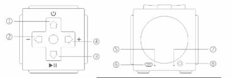 Руководство по эксплуатации I. Включение питания А. Нажмите кнопку питания на каждом динамике. Светодиодный динамик быстро мигнет II. Синхронизация динамиков А. Нажмите и удерживайте кнопку воспроизведения на любом из двух динамиков в течение 3 секунд B. Когда вы слышите «Поиск вечеринок», динамики входят в режим сопряжения C. Когда вы услышите «Подключение к вечеринке», колонки успешно соединяются D. Светодиодный динамик на первичном/левом динамике будет медленно мигать дважды Каждый цикл. Светодиодный на вторичном/правом динамике будет медленно мигать, как только Каждый цикл III. Подключение V Bluetooth: Найдите «8bitdo Twin Cube' в настройках Bluetooth вашего устройства, нажмите для подключения. Аудиокабель v: подключите аудиокабель к Порту AUX для подключения основного динамика. Примечание: двойные кубические динамики автоматически подключаются к последнему сопряженному устройству. IV. Воспроизведение музыки V Play: (1) воспроизведение/пауза (2) AUX IN mode: бесшумный/звуковой сигнал V +/- : объем V. Выключение питания Нажмите и удерживайте кнопку питания на каждом динамике, чтобы выключить систему, вы услышите звуковой сигнал. Дополнительная информация I. Одиночный режим динамика А. Нажмите кнопку питания на любом из двух динамиков B. Найдите «8bitdo Twin Cube' в настройках Bluetooth вашего устройства, нажмите, чтобы подключить C. Светодиодный индикатор будет оставаться твердым, также будет звук, указывающий, что соединение успешно II. Отвечайте на телефонные звонки А. Воспроизведение музыки будет заменено на мелодию звонка, когда появится вызов в ближайшее время. B. Нажмите кнопку воспроизведения, чтобы ответить/остановить телефонный звонок C. Нажмите и удерживайте кнопку воспроизведения, чтобы продолжить воспроизведение музыки. III. Заряжайте аккумулятор А. Подключите usb-кабель, светодиодный кабель остается твердым B. Светодиодный выключается при полной зарядке аккумулятора C. Время зарядки ≥ 2,5 часа (1) Мощность (2) Объем- (3) воспроизведение/пауза/ответ на телефонный звонок (4) Громкость + (5) светодиодный аккумулятор (6) usb-порт (7) светодиодный Bluetooth (8) AUX IN