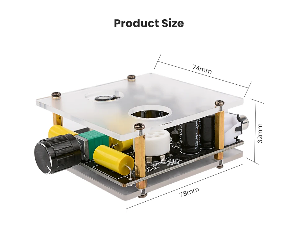 Источника питания: AC12V-15V, выше 1A, источника питания не превышает AC15V. (Рекомендуется источник питания AC12V 1A) Трубка: трубка 6J3 Панель буп: погрешность толщины платы 1,6 мм (стекловолокно FR4) Размер: 75*68 мм Продукт опорная труба: 6J1 6J2 6J3 6J4 6J5 6A2 6K4 6K5 6AK5 6AU6 6BA6 6BD6 EF93 6K7 GE5654 и т. д. Разъем питания: DC3.5/5,5*2,1 Буфер трубки увеличен примерно в 2 раза. Соединен между источником и передним или задним полюсом. Примечание: 1. Этот продукт не может управлять динамиками и наушниками. 2. Трубка должна быть вставлена в конец. При повороте переключателя на трубка светильник яркая трубка не подключена, сзади светильник включен, и продукт не будет работать. 3. Для соединительных проводов лучше всего использовать экранированные провода. Общие провода могут вызывать утечку или шум. Посылка включает в себя:
