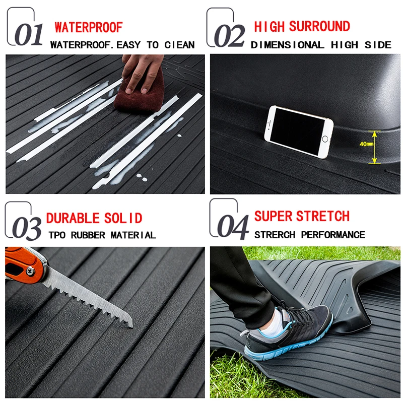 Эта жесткая Резина создана, чтобы выдерживать такие условия, как обработка тяжелых грузов, спортивное оборудование, инструменты, Садовые принадлежности и многое другое, защищая ваш оригинальный пол багажника.