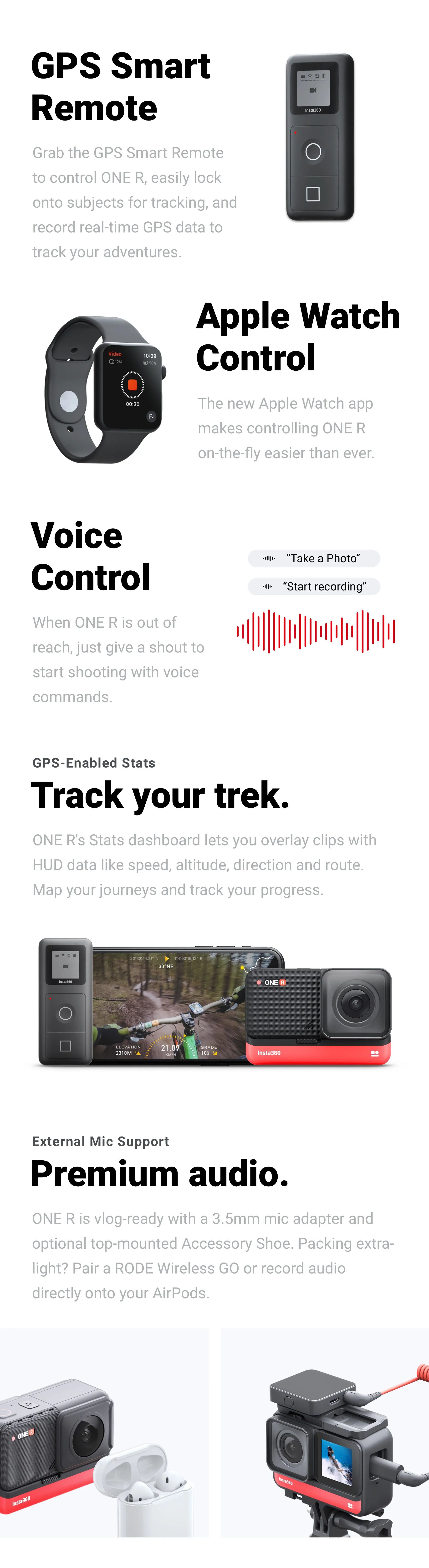 2. Премиум аудио: ONE R действительно vlog-ready, с 3-мической стерео обработкой с интегрированным шумоподавлением ветра-лучшее качество звука от Insta360 еще. Кроме того, один R, а также совместим с любым внешний микрофон с помощью 3,5 мм Входной сигнал mic (требуется USB-C до 3,5 мм адаптер продается отдельно) И может быть сопряжен с всегда популярными Apple AirPods для беспроводного аудиовхода (функция будет выпущена через обновление прошивки).