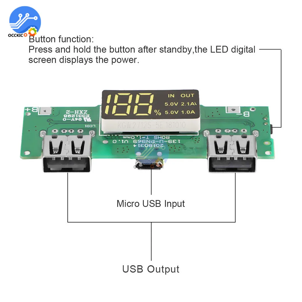 Этот модуль представляет собой портативный резервный источник питания с входом, который соответствует адаптеру 5,0 V для зарядки внутреннего аккумулятора. Применение встроенный аккумулятор для портативного устройства для того, чтобы обеспечить 5,0 V/3.0A USB2.0 Питание выход для внешних устройств.