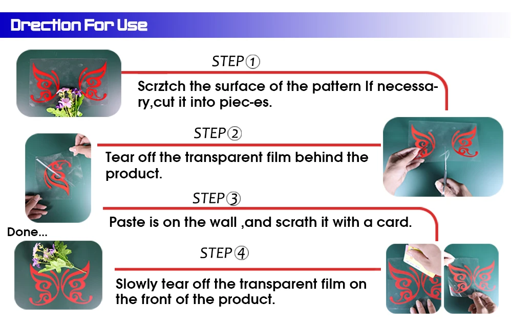 4. Аккуратно очистите прозрачную пленку от задней части продукта, при наклеивании приклейте середину, а затем приклейте ее влево и вправо, затем медленно оторвитеПоверхность прозрачной пленки. Красивый. Q:Можно ли снять наклейки? Q:Можем ли мы сделать наклейку другого размера? Q:Можем ли мы настроить цвет, который мне нужен? A:Да, пожалуйста, сообщите нам. У нас много цветов, но мы не ставим все цвета в выбранное положение. Мы можем предоставить все цвета, которые могут предоставить другие продавцы. Q:Можем ли мы настроить некоторые наклейки, которые мне нужны? А:Да,Пожалуйста, свяжитесь с нами и сообщите нам, что вам нужно,Мы предоставим предложение, если сможем удовлетворить ваши требования. Q:Я считаю, что ваши наклейки отличаются от других продавцов. В чем разница? А:Да, наши наклейки используют новейшую китайскую технологию наклеек, чтобы убедиться, что наклейки чистые по цвету, прозрачные и красивые по внешнему виду. Наши наклейки очень удобны в использовании и не могут быть повреждены во время транспортировки. Q:Можем ли мы продать ваши товары? А:Да, мы поддерживаем прямую доставку,Пожалуйста, свяжитесь с нами, мы можем порекомендовать лучшую логистику в вашей стране. Мы также поддерживаем оптовые продажи. Мы предоставим вам лучшие продуктыВ Лучшая ЦенаИ лучший сервис!