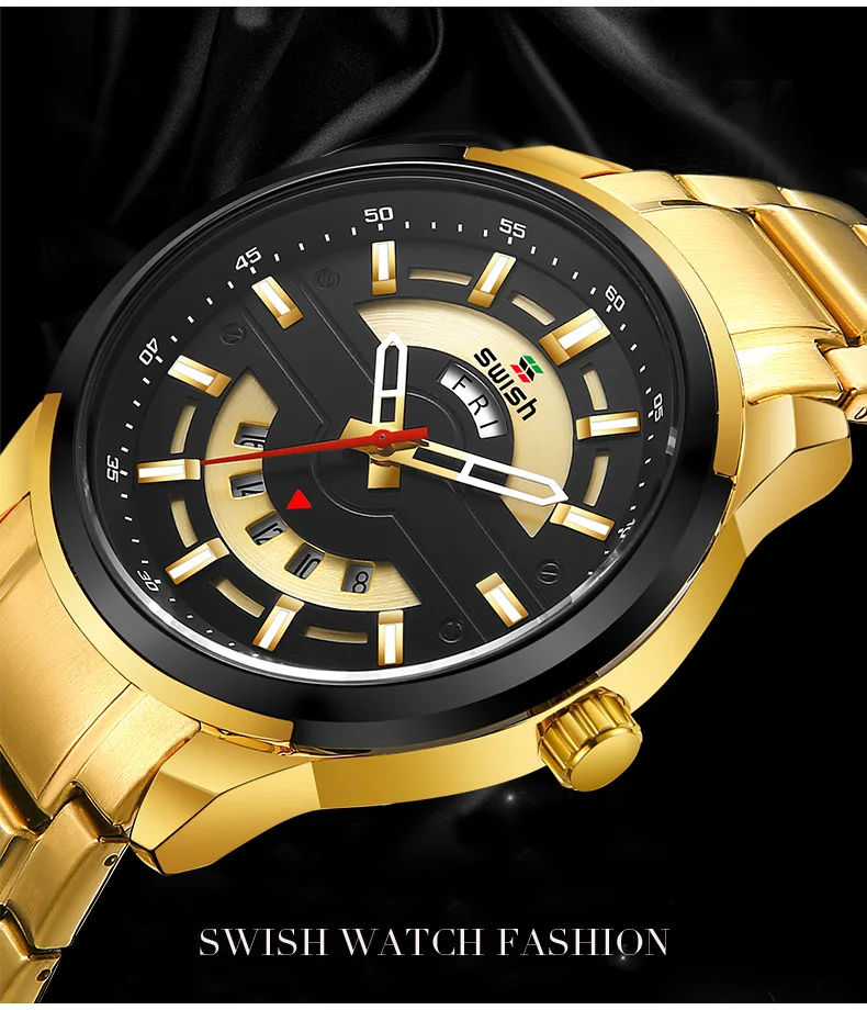 Бренд: SWISH Стиль: спортивный, Повседневный, деловой, модный Механизм: оригинальный кварцевый механизм Основная особенность * 100% новые и высококачественные ** 3 АТМ/30 М Водонепроницаемость (поддержка холодного душа и плавания, не используйте часы под водой, не поддерживайте горячую воду); *** Качественный чехол из нержавеющей стали; **** Качественная нержавеющая сталь 1 * набор = 1 * SWISH Watch