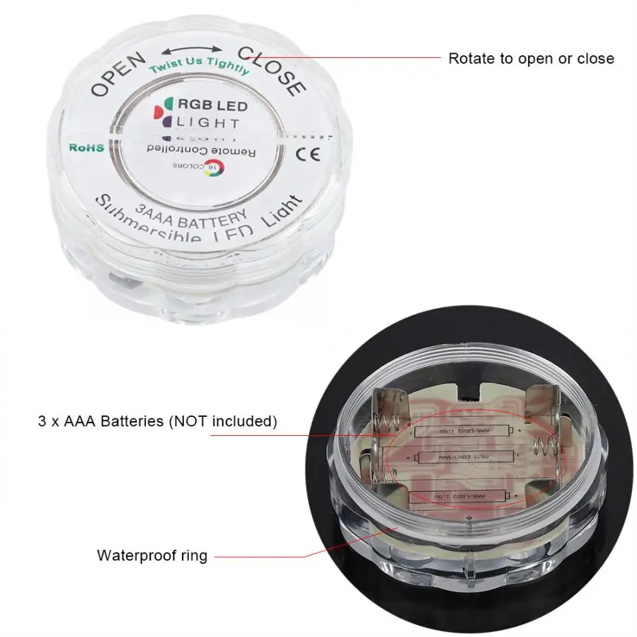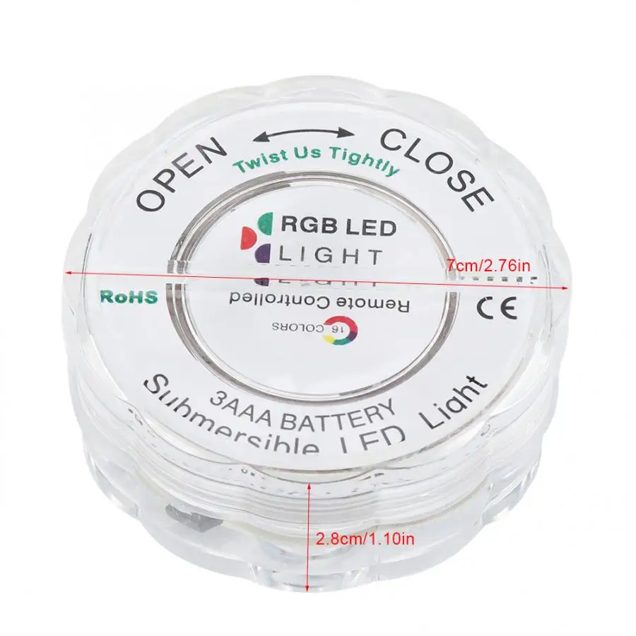Этот светодиодный светильник небольшого размера, который может быть непосредственно помещен в воду, вы можете поместить его в вазу, пруд, фонтан, аквариум и сад. Дистанционное управление очень удобно, вы можете изменить светильник и настроить яркость одного статического светильник. Подходит для свадьбы, вечерние и рождественские праздники, чтобы создать комфортную атмосферу.