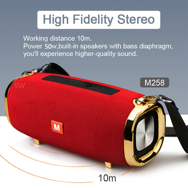 50 Вт M258 Bluetooth динамик уличная Беспроводная колонка Саундбар музыкальный центр сабвуфер 3D стерео Поддержка FM/TF/AUX caxia de som Мощность 50 Вт 4000 мАч встроенный аккумулятор внешний вид размер 30*15*15 см принимает усовершенствованный чип декодирования аудио Bluetooth, поддержка всех подключений устройств Bluetooth. 2, поддержка fm-радио, вы можете непосредственно искать станции в области прослушивания, точность Поиска составляет 100% 3. Звук мягкий, чистый и динамичный, с различными уровнями: 4. Прямое считывание tf-карты и u-диска: 5. Дальность приема Bluetooth составляет до 10 метров 6. Поддержка линии аудиовхода, чтобы предоставить вам функцию динамика компьютера. Может быть непосредственно подключен к мобильным телефонам/планшетам/и ТВ Bluetooth сопряженная музыка: с функцией громкой связи, Может осуществлять голосовую связь. Нормальное воспроизведение громкости может достигать 40-48 часов