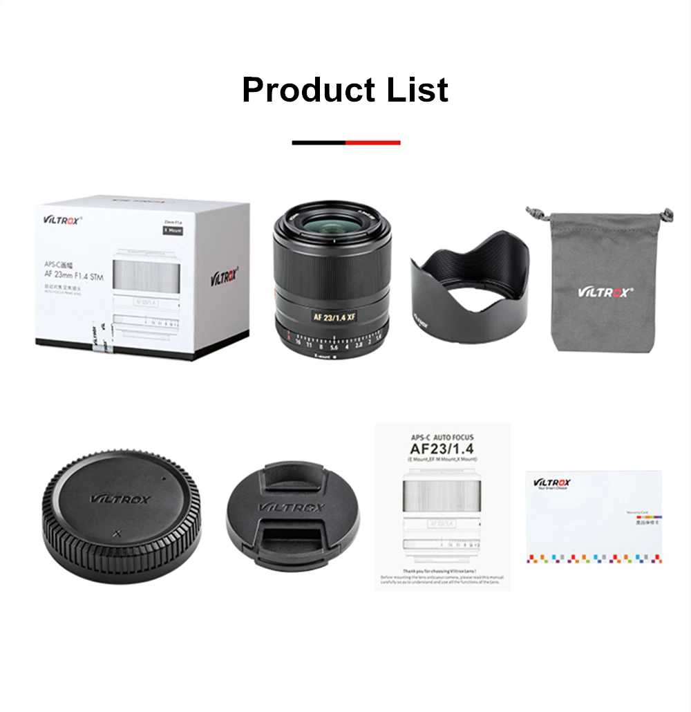 1 x Объектив Viltrox AF 23 мм F1.4 XF Крышка объектива-1 шт. 1 х Руководство пользователя 1 х бленда для объектива