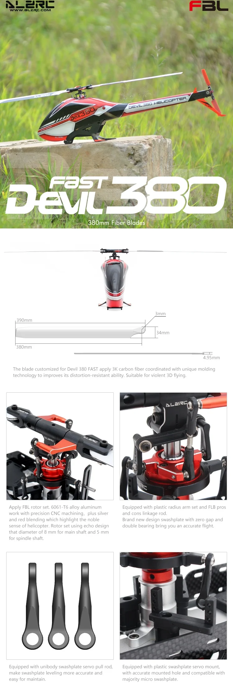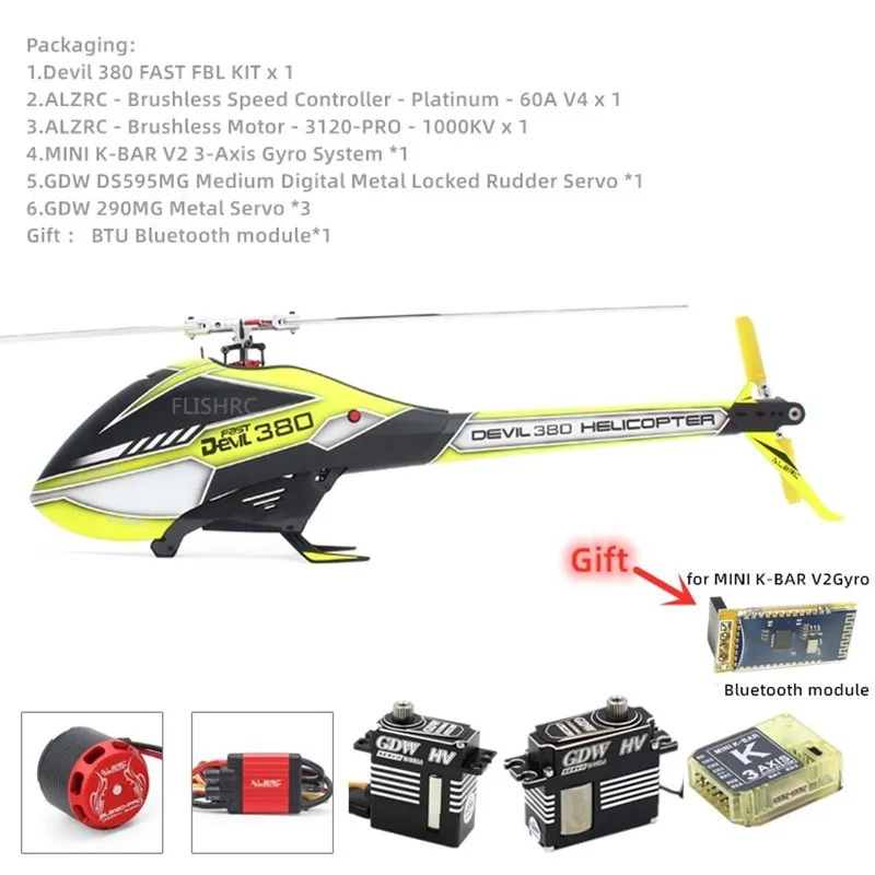 Спецификация: 1. Диаметр главного ротора: 856 мм2. Длина основного лезвия: 380 мм3. Диаметр хвостового ротора: 196 мм4. Длина хвостового лезвия: 70 мм5. Диаметр главного вала: 8 мм6. Диаметр хвостового вала: 5 мм7. Батарейный отсек: 44x44x130мм8. Вес (с электроникой):1100 г (без батареи)Радиопередатчик и электронное оборудование, необходимое для сборки: 1. Передатчик: 6-канальный или больше, система вертолета2. Приемник: 6-канальный или больше3. Шаг: цифровой шаг4. Батарея: 6S/22,2 V 1600 ~ 2600mAh Li-Po батарея5. Двигатель: RMC-BL3120 1000kv 6S бесщеточный мотор (5 мм шпиндель) x 16.ESC: 50 ~ 80A бесщеточный ESC x 17. Сервопривод Swashplate: микро Цифровой Металлический сервопривод x 38. Хвостовой замок сервопривода: Средний Цифровой Металлический сервопривод x 19. Гироскоп: безходовая Гироскопическая система x 110. Другие: набор инструментов для подключения и сборки Упаковка:1.Devil 380 FAST FBL KIT x 12.ALZRC-бесщеточный контроллер скорости-Platinum - 60A V4 x 13.ALZRC-бесщеточный мотор-3120-PRO - 1000KV x 14. Мини K-BAR V2 3-Axis Gyro Системы * 15.GDW DS595MG Средний Цифровой Металлический блокированный руль сервопривод * 16.GDW 290MG металлический сервопривод * 3 Подарок: модуль Bluetooth * 1