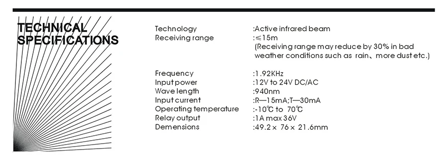 Площадь детектора: в помещении 20 м. Уличный 10 м Рабочее напряжение: 12 В, 24 В постоянного тока (не может работать с мощностью переменного тока, руководство пользователя неправильно) Рабочий ток: 50 мА Температура: + 70 ~ (-20) Размер: 76x49,2x21,6 мм Водонепроницаемость, УФ-защита