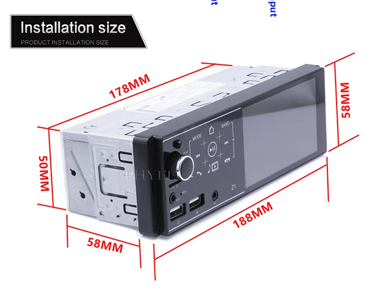 * Стандартный 1 din Размер * 4,1 дюймов емкостный сенсорный экран * Разрешение 854x480 HD экран • Сенсорные кнопки * 7 видов цветов освещения * Поддержка языка меню hinese, английский, русский, испанский, французский, португальский, немецкий, итальянский, турецкий, чешский, тайский, польский * Зеркальная Ссылка для телефона Android * Зеркальная ссылка для iPhone Примечание: необходимо подключать bluetooth при использовании mirror link. Bluetooth предназначен для передачи аудио. • Bluetooth версии 4,0 * Bluetooth A2DP и Громкая связь * Поддержка внешнего микрофона (моно Тип) * Fm-радио тюнер с предустановленными 18 fm-станциями * USB порт, слот TF, Aux аудио вход слот * Воспроизведение формата видео 1080P HD * Воспроизведение аудио формата без потерь • Формат изображения воспроизведения • Управление с помощью рулевого колеса * Поддержка reversecamera вход * Поддержка настройки яркости * Электронный громкость, высокие частоты, бас, баланс, фейдер * Контроль громкости * Mute функции * Последнее положение памяти, воспроизведение медиапамяти продолжается * 2 выхода RCA видео * 1 способ RCA видео вход * 2 выхода RCA аудио * 1 задний Aux аудио вход * ИК беспроводной пульт дистанционного управления * 4*45 Вт Высокая выходная мощность * ISO разъем