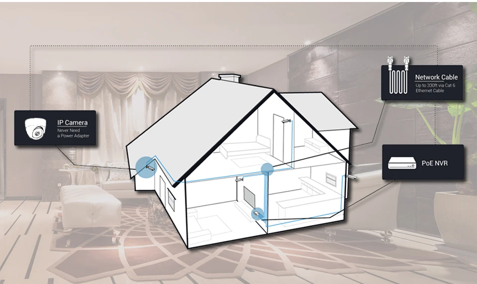 NVR и IPcameras построены с простыми в установке портами POE, чтобы сделать установку простой и Clutter-free.Each камера подключается к NVR с помощью одного кабеля Ethernet Который обеспечивает передачу HD видео и источник питания для камеры.