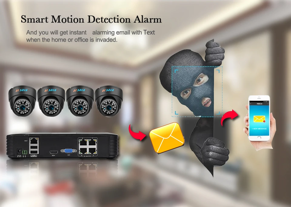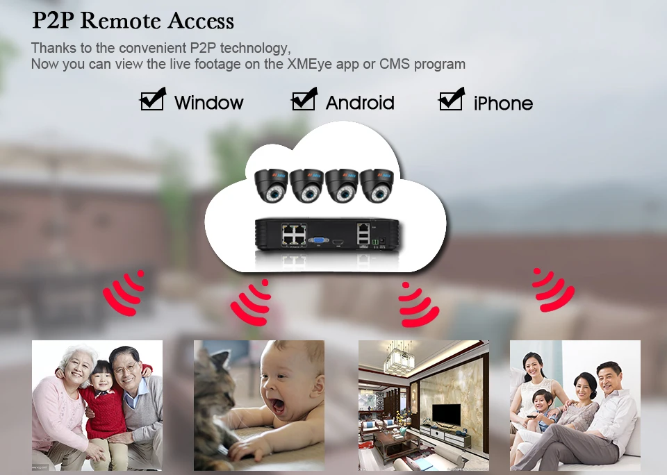 Посылка: 1 * 4CH PoE NVR 1*12V 5A Питание для NVR ( US/EU/AU/UK опционально) 1 * USB мышь 1 * Руководство пользователя для NVR 4 * купольная ip-камера Теплые советы: сетевой кабель Rj45 не включает