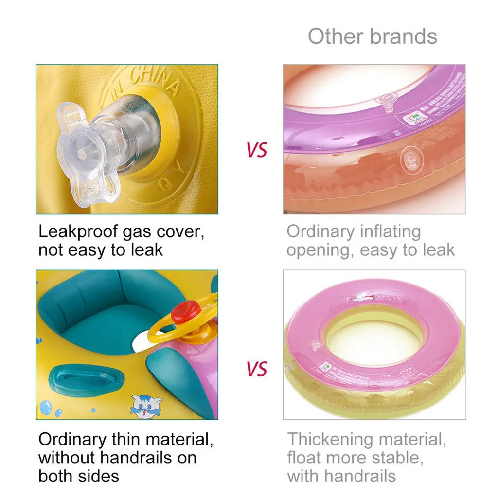 Ребенок Поплавковая лодка включает UPF 50 + солнцезащитный козырек, большое внешнее кольцо для флотации и два Ручки для стабильности и усиленное безопасное сиденье.