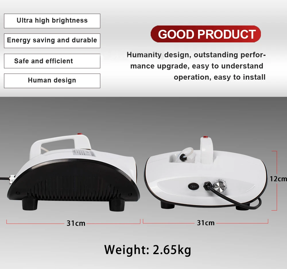 Power: 900W Voltage: AC 110V/220V 50/ 60Hz Smoke Output: 2000Cuft/min Warm-up time: 3-5minutes Spray Distance: 2-3 meters Fule Consumption: 30 min/L Capacity of tank : 100ml Unit Size: 36*23*38cm Unit Weight: 2.6kg Good Disinfection and Sterilization for Car, home, Office and Hotel etc. Note: 1.The machine no include fog oil; 2. Remote control no 23A 12V battery inside as arimail problem; 3. Before using , please heat for 3-5 minutes ; 4. Clean the fog machine, you can use white vinegar mix water follow 1: 8 proportion (White vinegar 1: water 8) ; 5. This is mini fog machince, just for small place using ; 6. When no using , please turn off the machine and plug out the power ; 7. Please don't touch the machine when using , it is very hot. Package Including: 1 * Atomizer Machine 1 * User Manual 1 * Power Cable