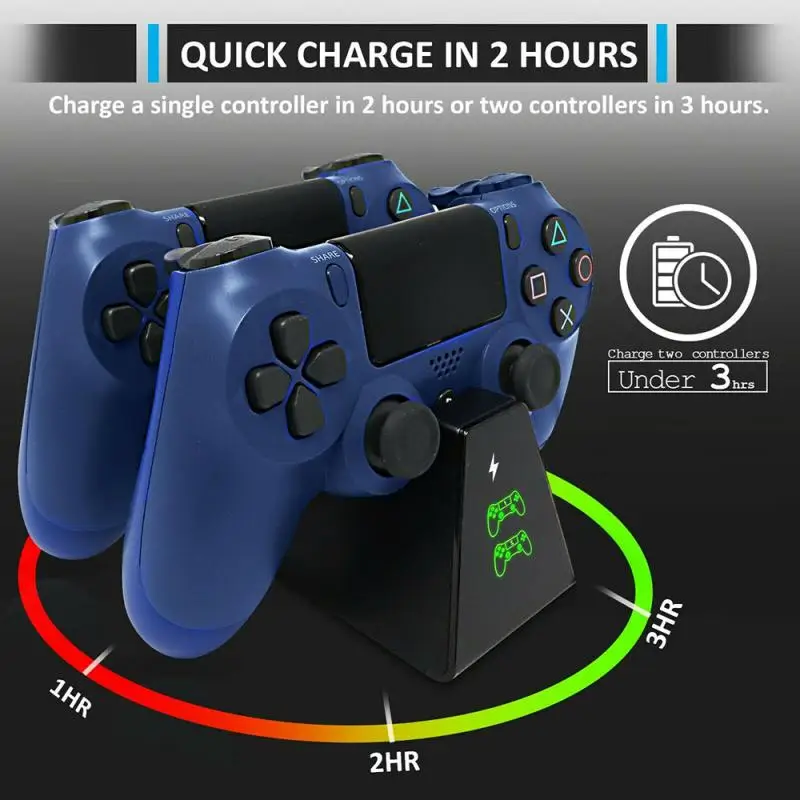 Быстрая зарядка в течение 2 часов-зарядная док-станция контроллера PS4 может заряжать два беспроводных геймпада контроллера PS4 одновременно в течение 3 часов, индивидуальный контроллер PS4 быстрее и может быть полностью заряжен в течение 2 часов. Зарядное устройство для док-станции PS4 может быть подключено через usb-порт вашей консоли PS4, ПК, внешний аккумулятор, ноутбук, практически все, с выходом USB.