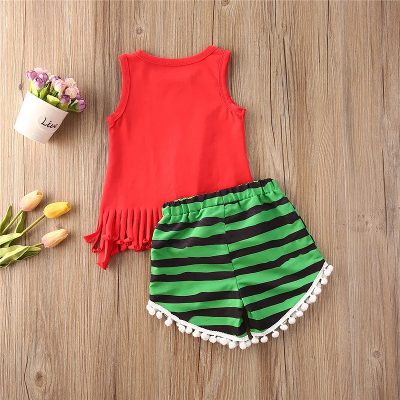 Брендовый хлопковый комплект одежды для маленьких девочек и мальчиков, От 1 до 6 лет, летний красный жилет без рукавов с буквенным принтом и кисточками для девочек топ + зеленые шорты в полоску с бахромой!