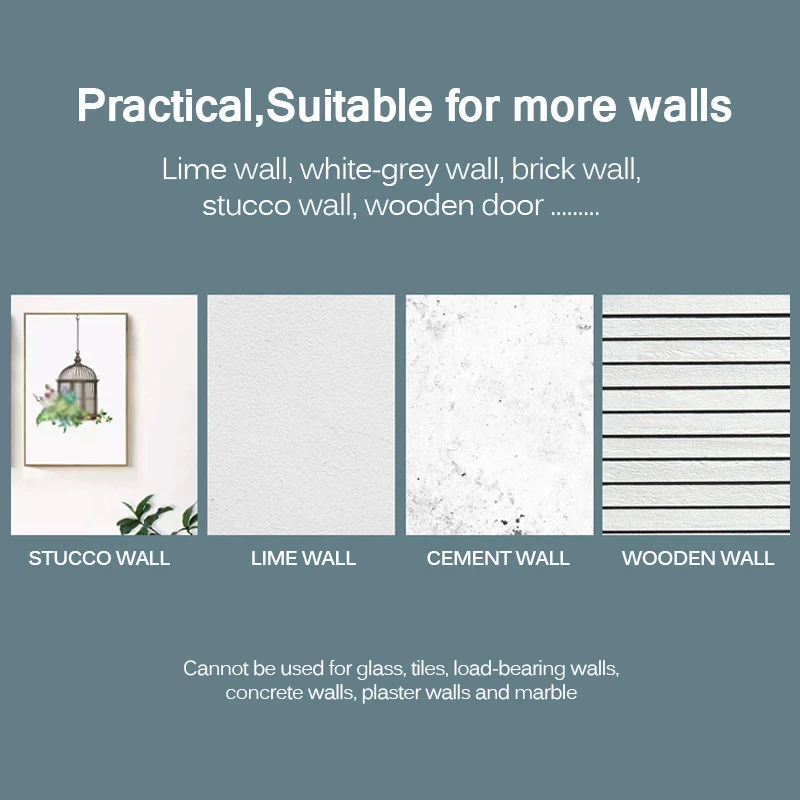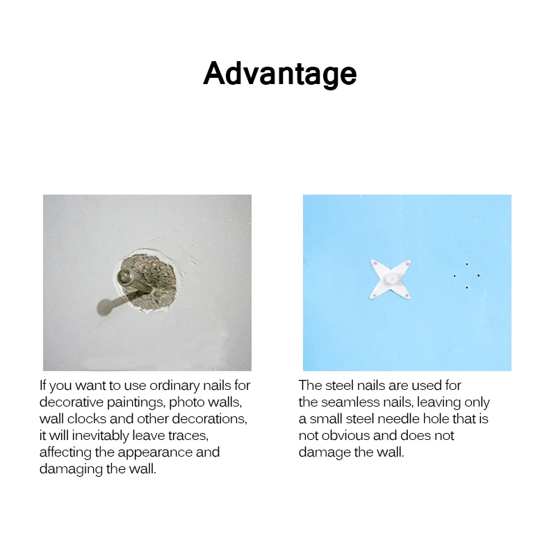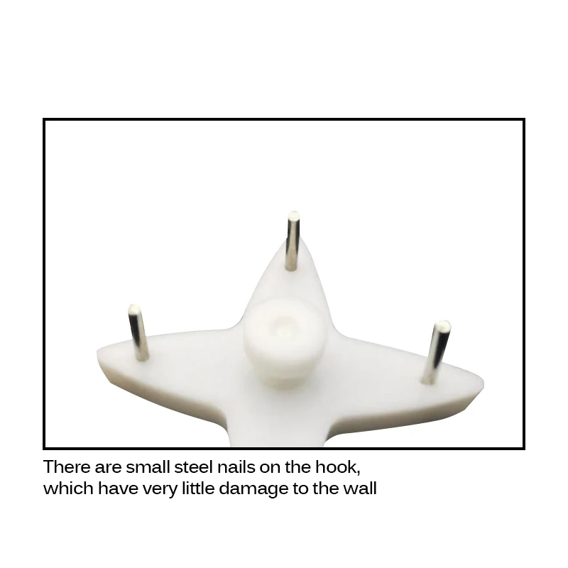 Бескаркасный настенный гвоздь принимает четыре мини-гвозди длиной 1,5 см/0,59 дюйма для фиксации на стене. Когда он не используется, на стене останется четыре мини-отверстия, их нелегко найти.