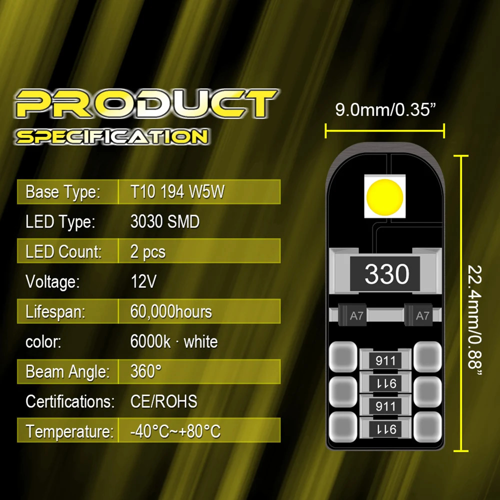 Основание: светодиодный T10 W5W 194 Чип-светильник: ультра яркий 3030SMD Рабочее напряжение: 12 В постоянного тока Светодиодный Цвет: белый Длина: 22 мм (0,87 дюйма); Ширина: 8,4 мм (0,33 дюймов)