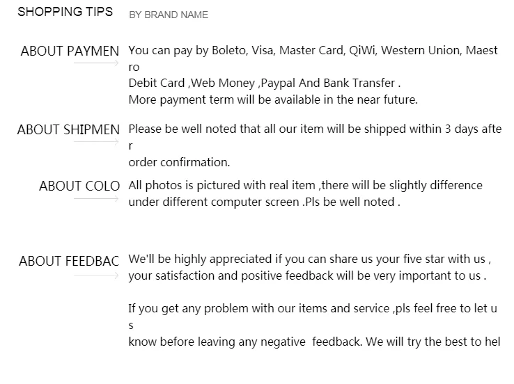 "1.Все товары будут оформлены в течение 2 рабочих дней после подтверждения оплаты. 2. Различные способы доставки имеют различное расчетное время доставки, поэтому, пожалуйста, выберите подходящий способ доставки, когда вы размещаете заказ! 3. Больше вопросов о доставке, пожалуйста, свяжитесь с нами."