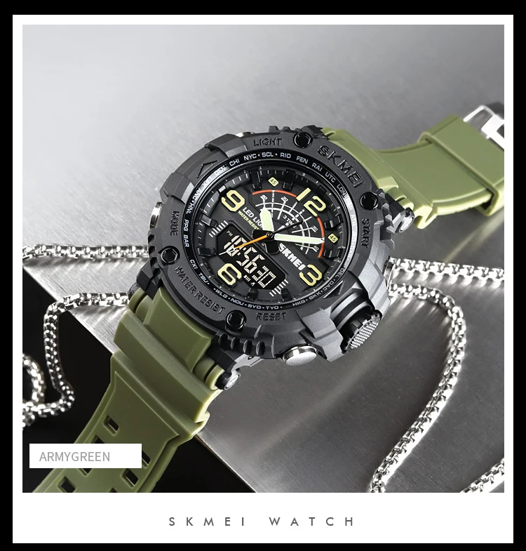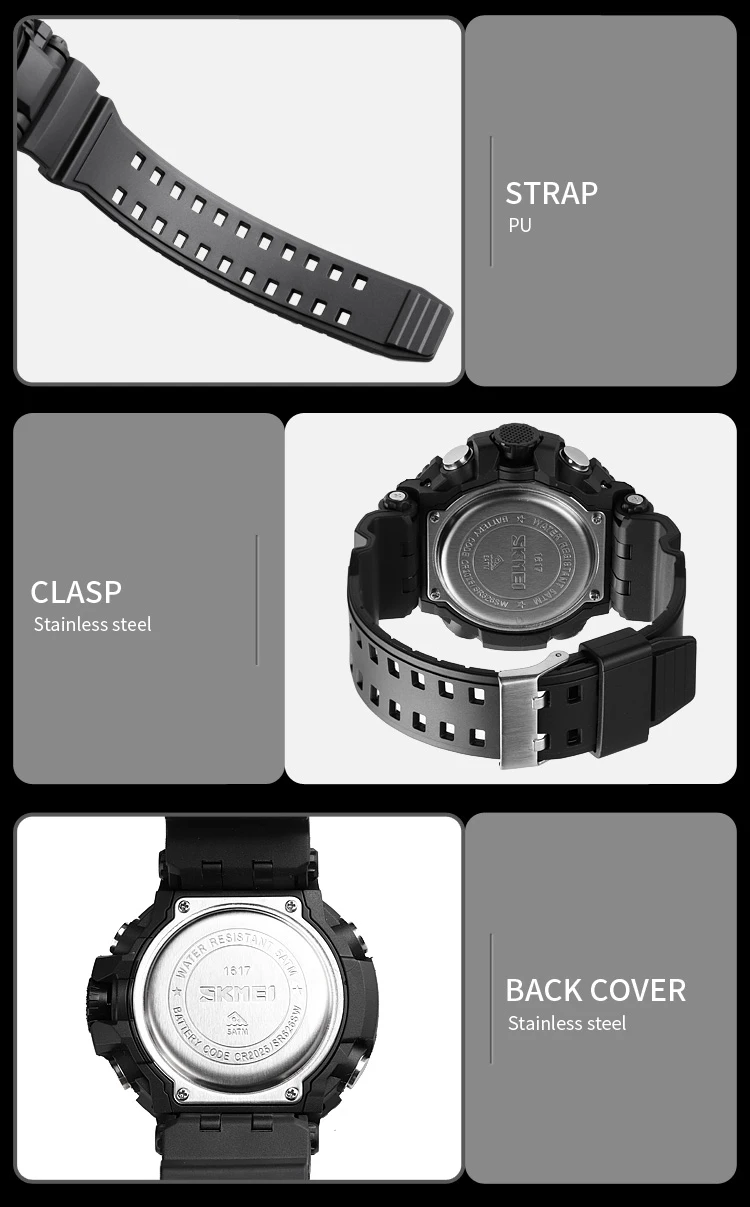 Основная информация о товаре: Бренд: SKMEI Модель: 1617 Вес: 70 г MOV T: Цифровой С украшением в виде кристаллов: смола Чехол: ABS + PU Ремень: ПУ Пряжка: нержавеющая сталь Ш/П: 50 м Функция: 3Tme,Chrono,Alarm, Дата, неделя, светодиодный светильник, отсчет, 12 В/24hourclock 。
