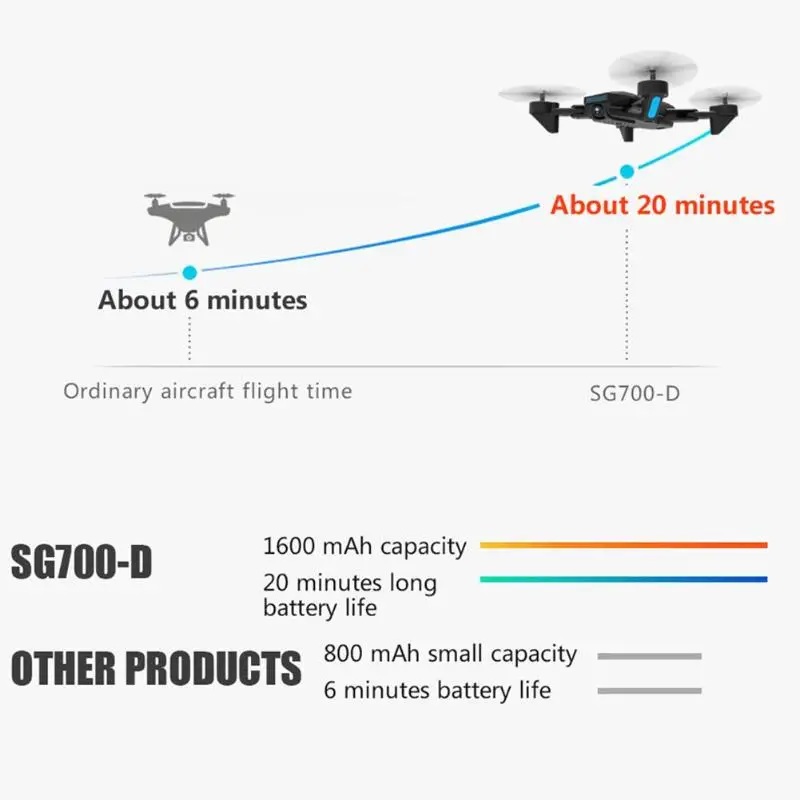 4K HD Разрешение камеры, 50X фокус, 1080P камера, WiFi подключение, позволяет делать фотографии на воздухе более четкими и прохладными. Три режима работы для регулировки, просты и удобны в использовании и эксплуатации. Две ручные позиции: одна или двойная рука для настройки для записи фотографий. Это позволит вам иметь как прекрасные изображения в режиме реального времени, передаваемые с неба, так и местность под самолетами. 3,7 V 1600 мА/ч, большая емкость аккумулятора, длительное время работы в режиме ожидания, все направления Регулируемый использования. Скорость дрона регулируется для вас по желанию, чтобы удовлетворить ваши различные потребности. Дрон поддерживает складную конструкцию, хорошую стабильность, компактный размер и легкий вес, чтобы взять и носить с собой. Легко и удобно для установки и удаления. Подходит для SG700-D аксессуаров для Дронов.