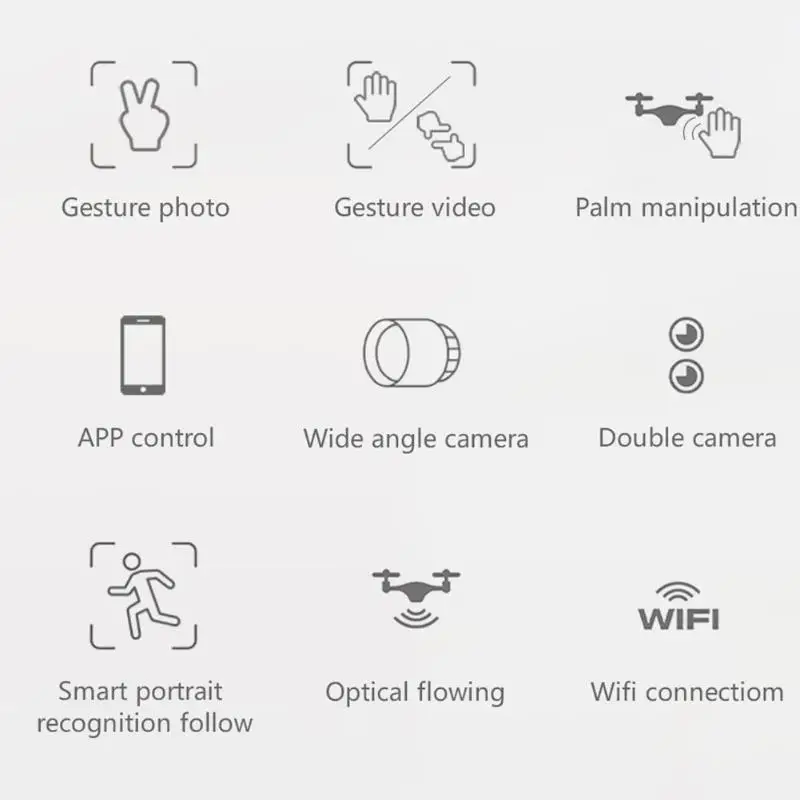 Бренд: ZLL Размер продукта: 40*30*6 см/15,74*11,81*2,36 Размер складывания: 17*14,5*6 см/6,69*5,71*2,36 Вес: 165 г Цвет: белый/черный Посылка Вес: 612,6 г Батарея дистанционного управления: батарея AAA * 2 (не входит в комплект) Батарея параметры: 3,7 V 1600mAh Объектив: широкоугольный объектив Время полета: 20 минут Время зарядки: 80-100 минут Расстояние на рисунке: около 80 м Расстояние дистанционного управления: около 100 м Фото жестов: 1-5 м Видео жестов: 1-5 м Портрет: 1-5 м Управление ладонями: 1-5 м Разрешение фото: (фронтальная камера) 1280*720P, (под камерой) 1280*720P Разрешение видео: (фронтальная камера) 1280*720P, (под камерой) 1280*720P