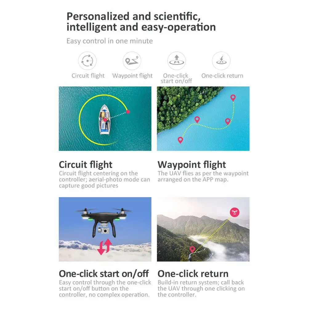 5,1080 P HD стабильная и четкая съемка: она имеет богатую и практичную съемку, оснащенную камерой высокой четкости 1080P, вы можете легко достичь аэрофотосъемки, поможет вам снимать крупногабаритный материал.