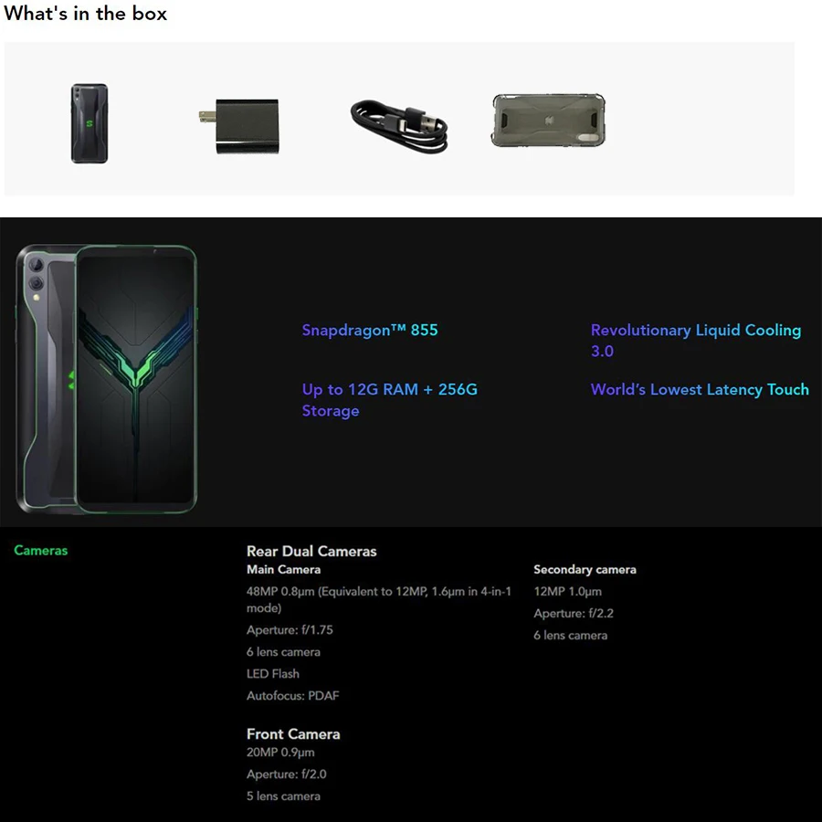Модель Xiaomi Black Shark 2 Сеть ---------------- сеть Частотный диапазон "FDD LTE (Частотный диапазон B1,B3,B4,B5,B7,B8,B20) Международная Версия: FDD LTE (Частотный диапазон B1,B3,B4,B5,B7,B8,B20,B28)" TDD LTE (Частотный диапазон B34,B38,B39,B40,B41) TD -SCDMA (Частотный диапазон B34,B39) WCDMA (Частотный диапазон B1,B2,B5,B8) GSM (Частотный диапазон B2,B3,B5,B8) CDMA/EVDO (Частотный диапазон BC0) Размер дисплея ------------- 6,39 дюйма AMOLED 19,5: 9 полноэкранный дисплей Разрешение дисплея ---- разрешение 1080*2340 Процессор --------------------- Snapdragon™855 процессор премиум-уровня 2,84 ГГц GPU ------------------- Adreno™640 графический процессор Система ------------------ Android 9,0 (пирог), обновленная до Android 10, JoyUI 11 Задняя камера ---------- 48MP + 12MP Фронтальная камера ---------- 20 МП Емкость аккумулятора ------ 4000 мАч Распознавание ---------- отпечатков пальцев (под дисплеем, оптический) SIM -------------------- две sim-карты Хранение ----------------- 128 ГБ 6 ГБ RAM, 128 ГБ 8 ГБ RAM, 256 ГБ 12 Гб RAM