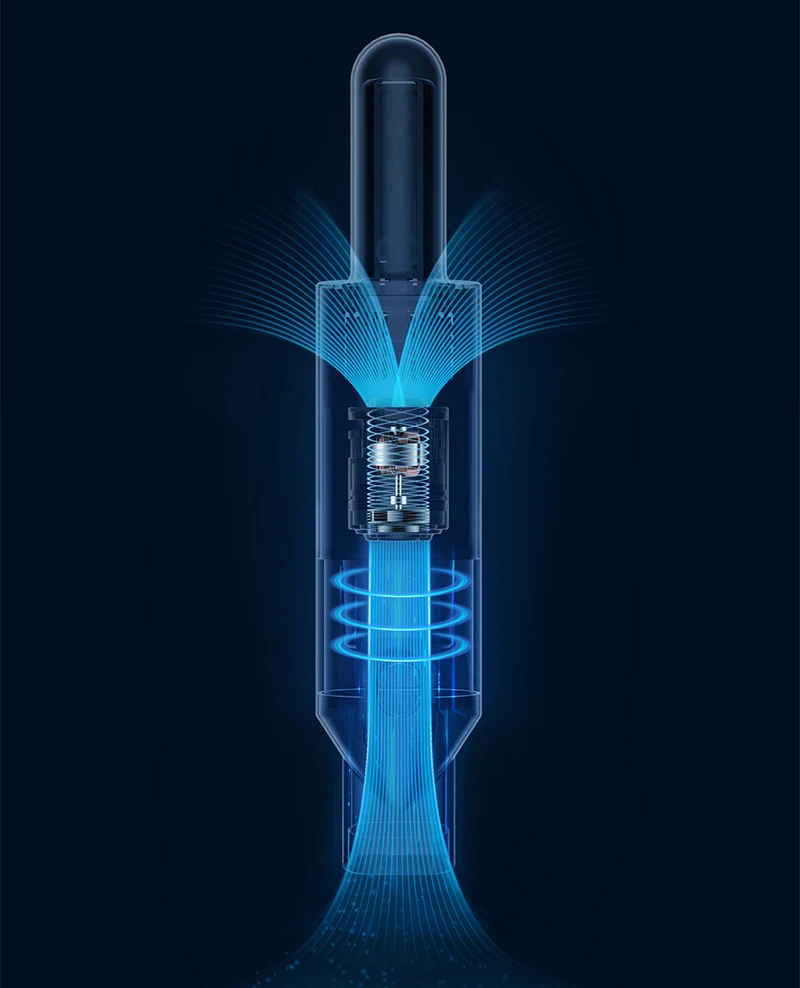 Аэродинамическая траектория ветра Оптимизируя структуру траектории ветра, сопротивление ветра и шум ветра уменьшаются, мощность всасывания не ослабляется в течение длительного времени, и эффект удаления пыли значительно улучшается. Воздушный поток выдувается с обеих сторон наклонной задней части и не будет дуть пыль на земле и руки и лицо пользователя.