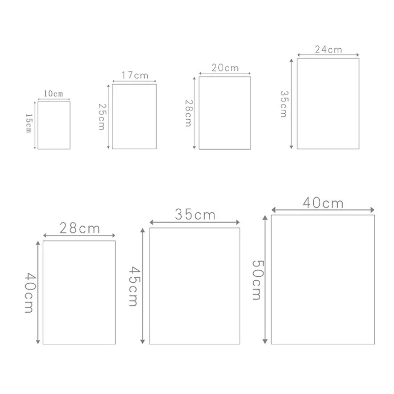 Размер: 10*15 см, 17*25 см, 20*28 см, 24*35 см, 28*40 см, 35*45 см, 40*50 см