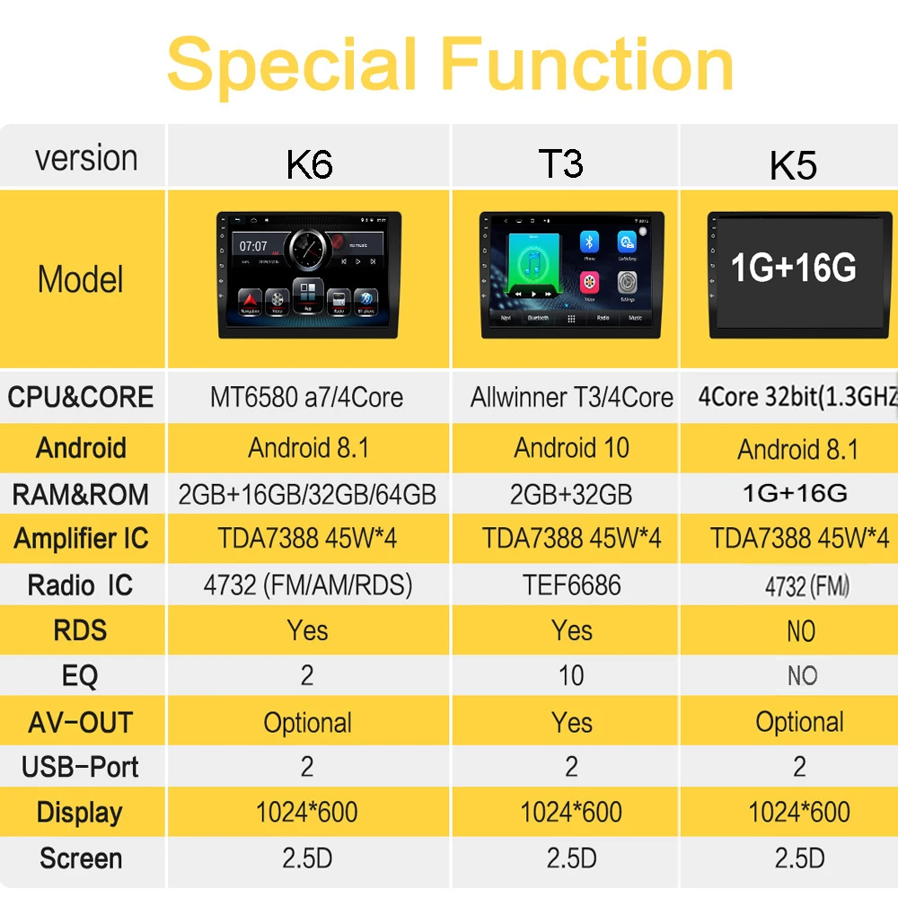 ОС: чистая Операционная система Android 8,1/10 RAM + ROM: 2 ГБ + 16 ГБ/2 ГБ + 32 ГБ/2 ГБ + 64 ГБ Поскольку система занимает внутреннюю память, операционная система занимает около 4-6 ГБ памяти. ЦП: четырехъядерный Звуковой процессор: TDA7388 4x45 Вт Поддержка изменения логотипа, пароля заводского набора: 8888, изменение логотипа Разъем питания: подключи и работай Встроенный GPS -Поддержка 2D HD и 3D карт Определение: емкостный экран 2.5D HD 1024*600 пикселей --- Поддержка внешнего мобильного U-диска и жесткого диска формата FAT32 (без ограничения емкости) --- Интернет-развлечения, Встроенный Wi-Fi модуль. --- Поддержка видеоигр HD 1080p, зеркальной связи и Airplay. --- Радио: FM / AM-радио с 30 предопределенными станциями Языки: испанский, немецкий, упрощенный китайский, традиционный китайский, французский, Японский Корейский Тайский Турецкий греческий корейский польский датский голландский Чешский румынский малайский шведский Словацкий иврит вьетнамский финский упрощенный китайский традиционный китайский Функция двойной зоны (пользователь может слушать музыку или радио в режиме GPS-навигации) --- Встроенная гарнитура Bluetooth и телефонная книга, поддержка A2DP, воспроизведение музыки напрямую с телефона. (Вам необходимо согласиться на разрешение телефона и синхронизировать контактную информацию в настройках телефона) Совместимость с управлением рулевым колесом Электронная и механическая Противоударная система --- Мощный стерео аудиовыход, поддерживает 4 динамика ---- Вход для камеры заднего вида (поддержка AHD 1080p) Обратите внимание: эта статья не имеет функции DVD / CD, но она поддерживает жесткий диск, мобильный USB / U диск.
